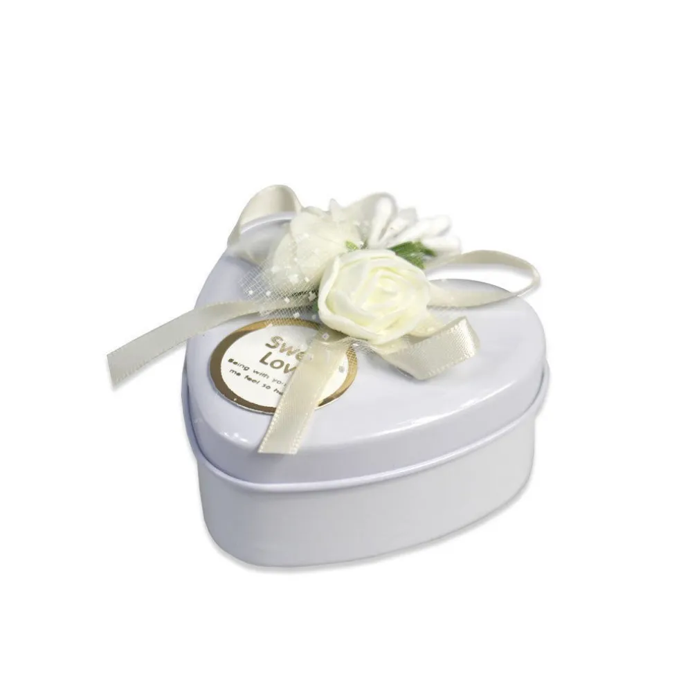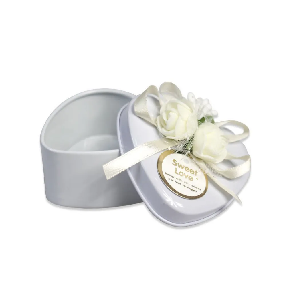 Raffinate e innovative scatoline portaconfetti a forma di cuore in latta dove inserire confetti o caramelle. Decorate con rosa e scritta “Sweet love”. Perfette per celebrare un matrimonio o una comunione.