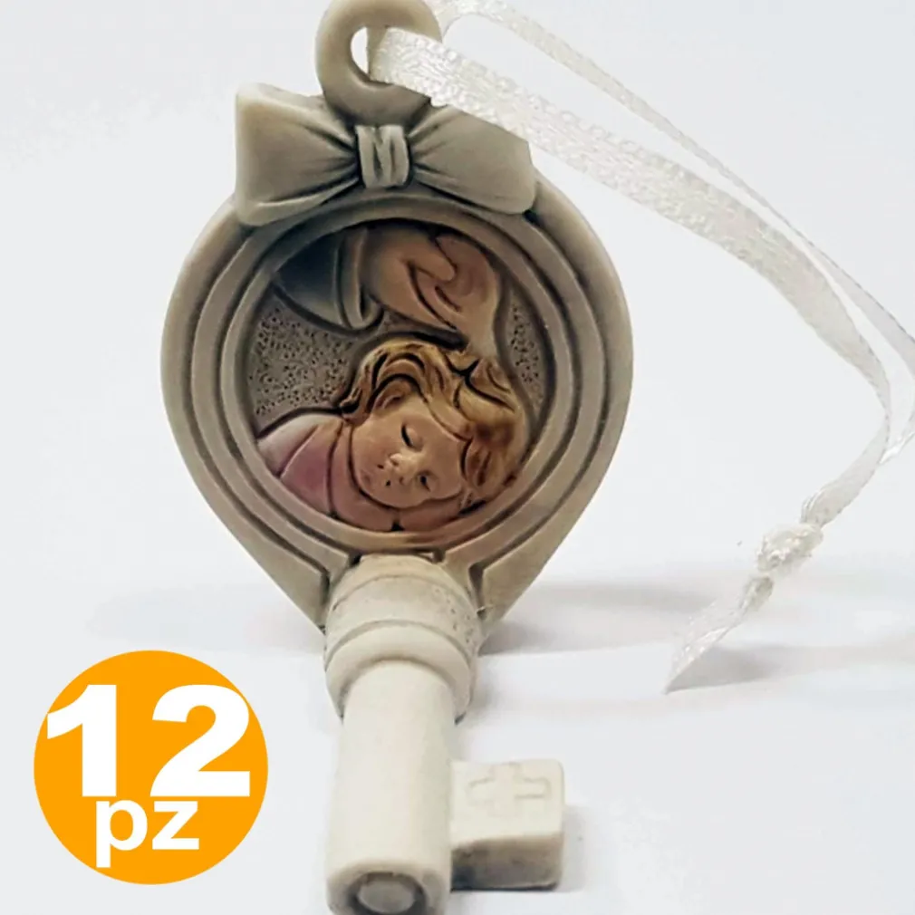 SET 12 PEZZI BOMBONIERA BOMBONIERE CHIAVE FIOCCO GANCIO BATTESIMO BAMBINA SACRA SACRAMENTO SIMBOLO BIANCO CERAMICA APPENDINO.