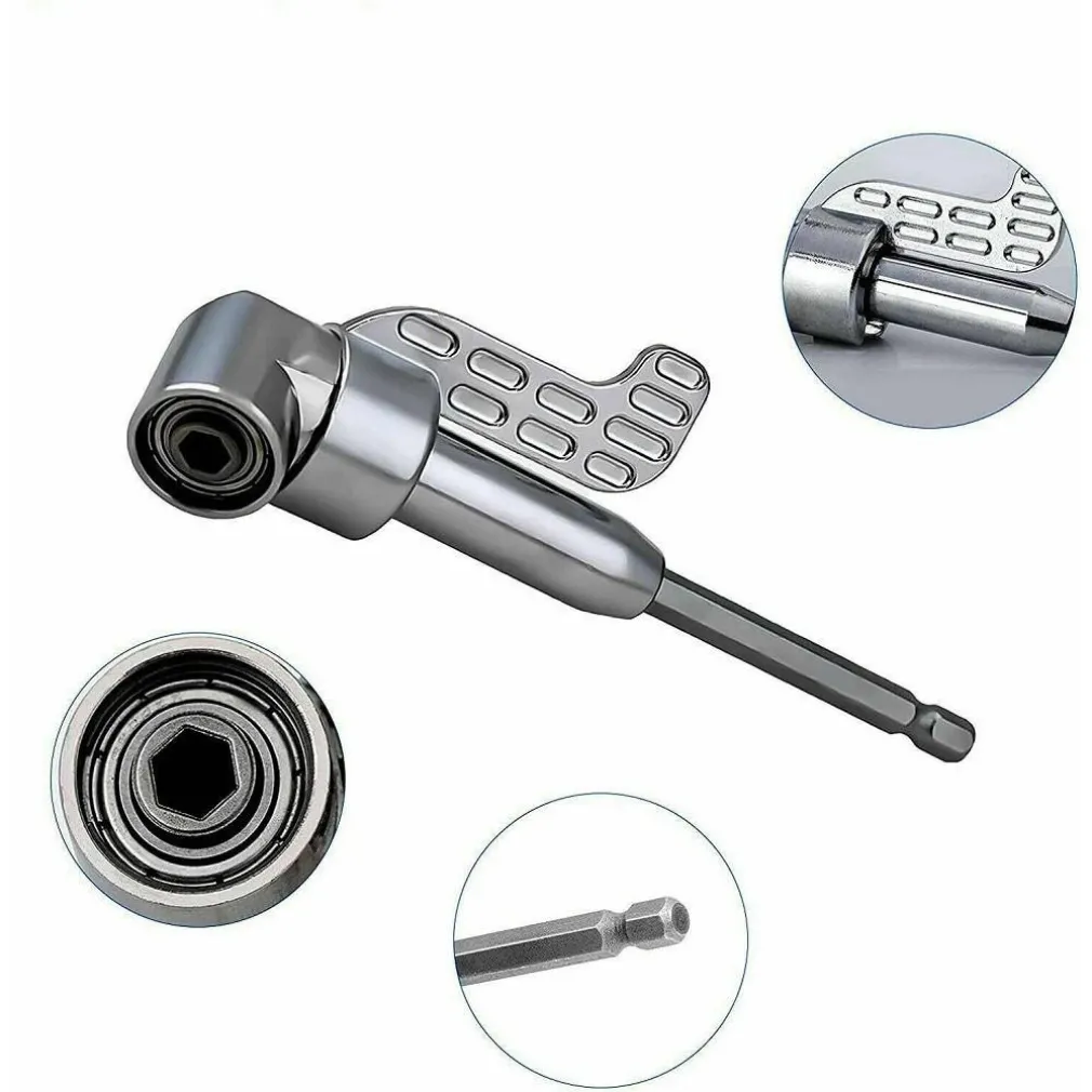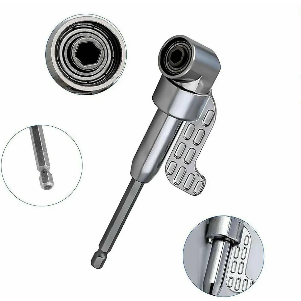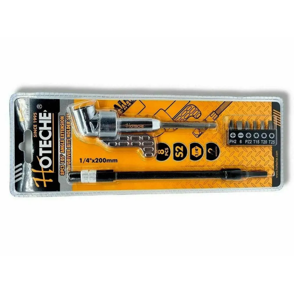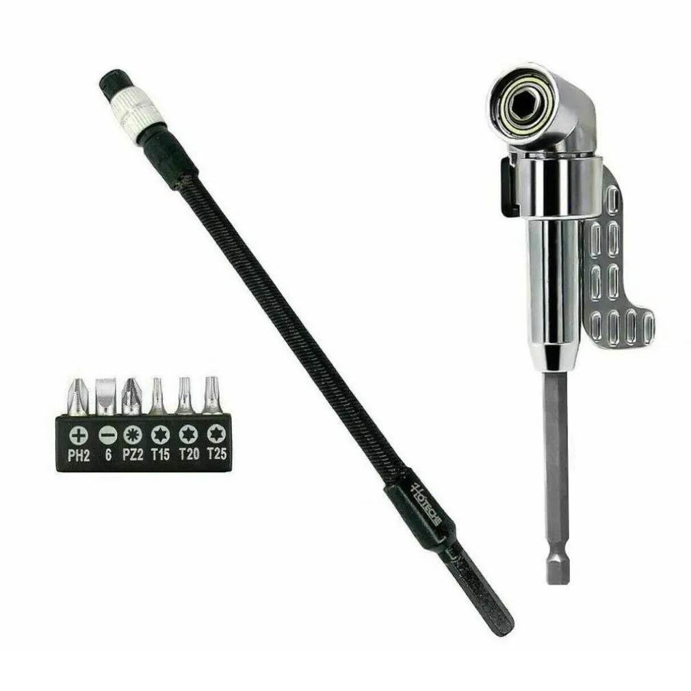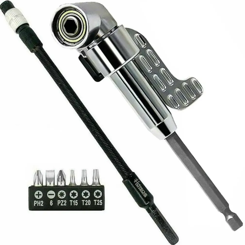 Comodissimo adattatore angolare a 105° per avvitatore/trapano, utile in zone dove il normale cacciavite dritto non può essere utilizzato o in quei spazi stretti dove l’avvitatore non entra. Nel kit ci sono 6 inserti con le impronte più comuni come, croce, taglio, torx. Incluso nel kit c’è un flessibile lungo 200 mm sempre da 1/4″ di ulteriore utilità per spazi difficili da poter operare.