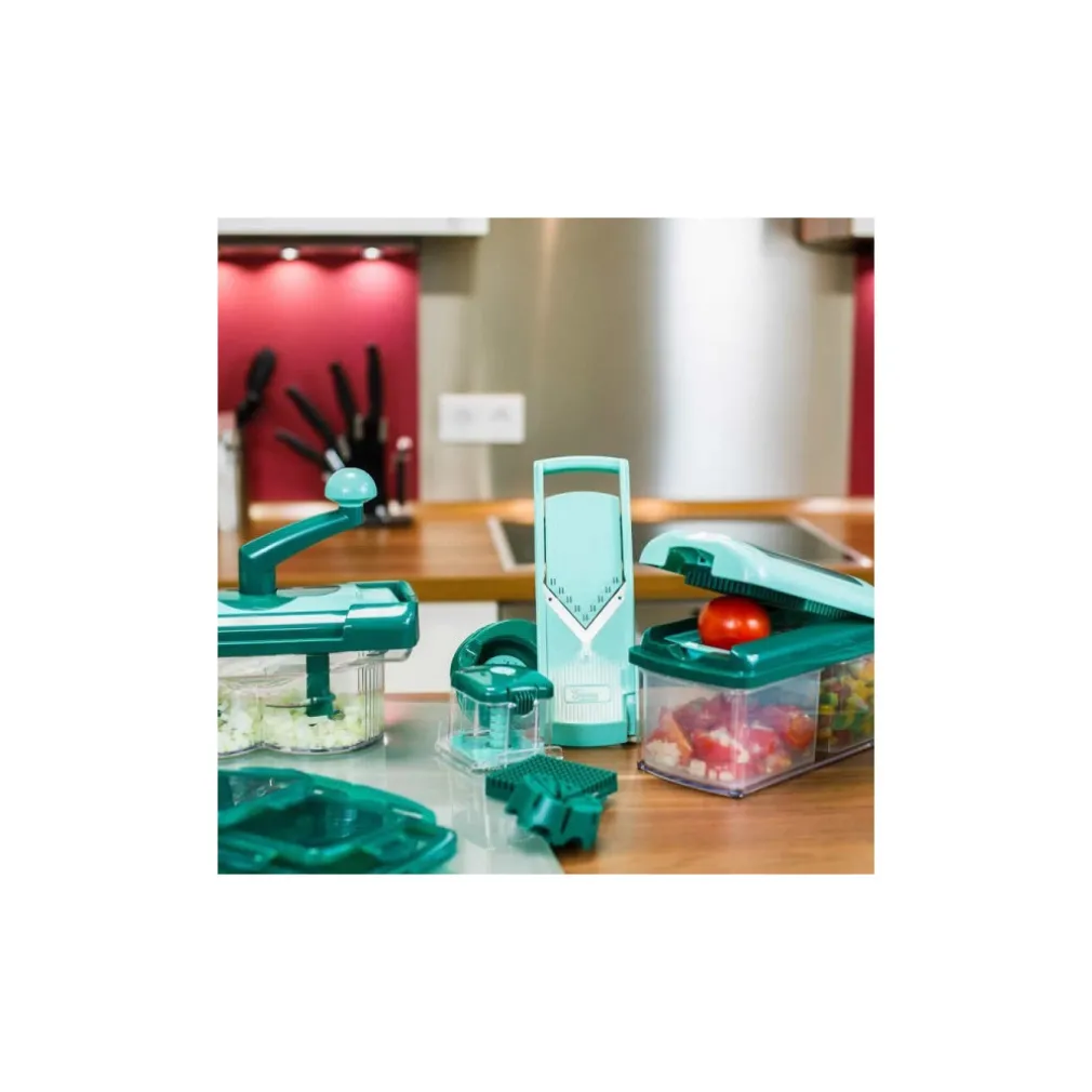 Nicer Twist è un pratico e ingegnoso accessorio da cucina, affettatrice manuale con cui potete tagliare a pezzetti, tritare, mescolare, ridurre in purea e frullare gli ingredienti da cuocere, tutto senza filo elettrico.