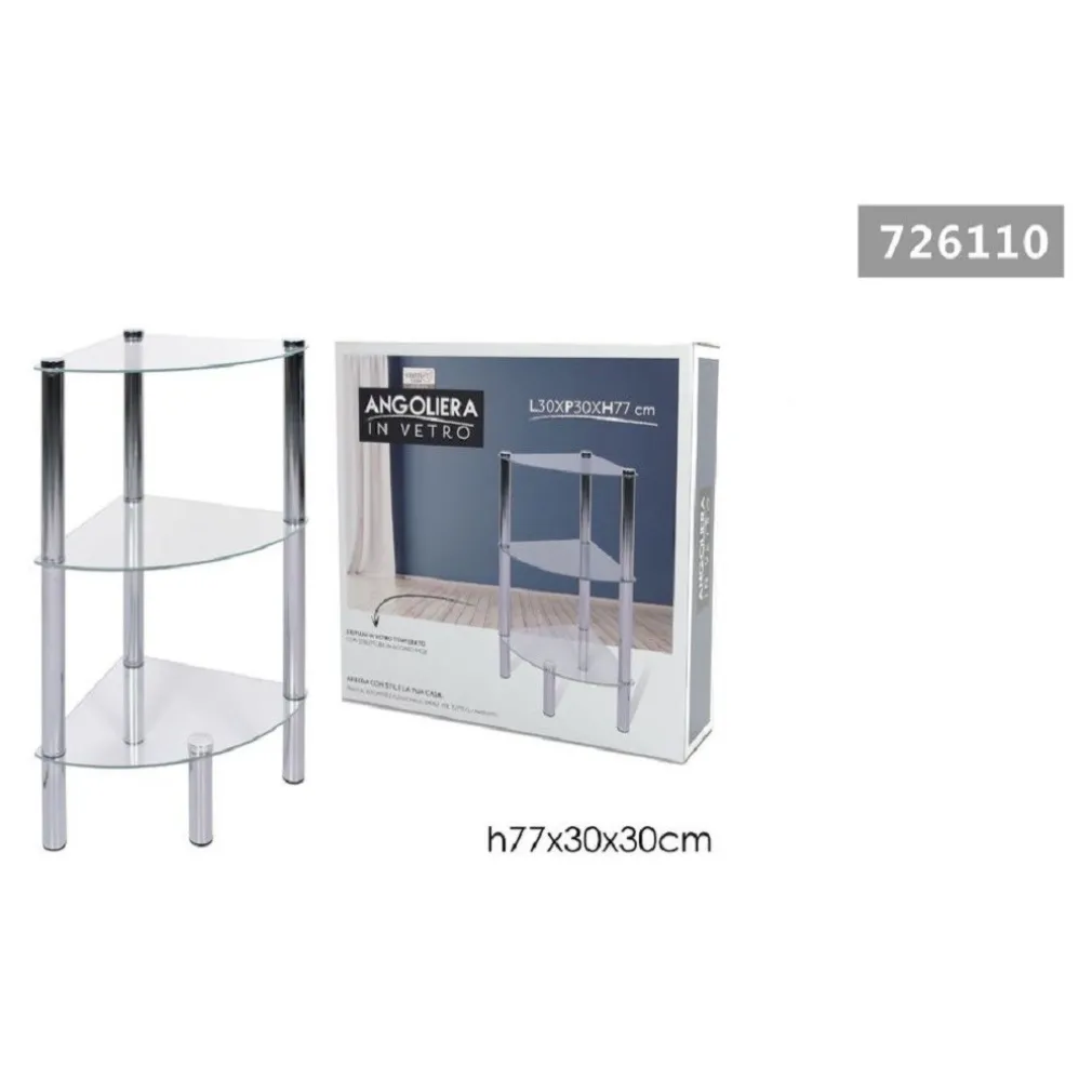 Angoliera 3 ripiani in vetro trasparente con struttura in metallo. Pratica e funzionale, arreda ogni ambiente con stile facendo risparmiare spazio.