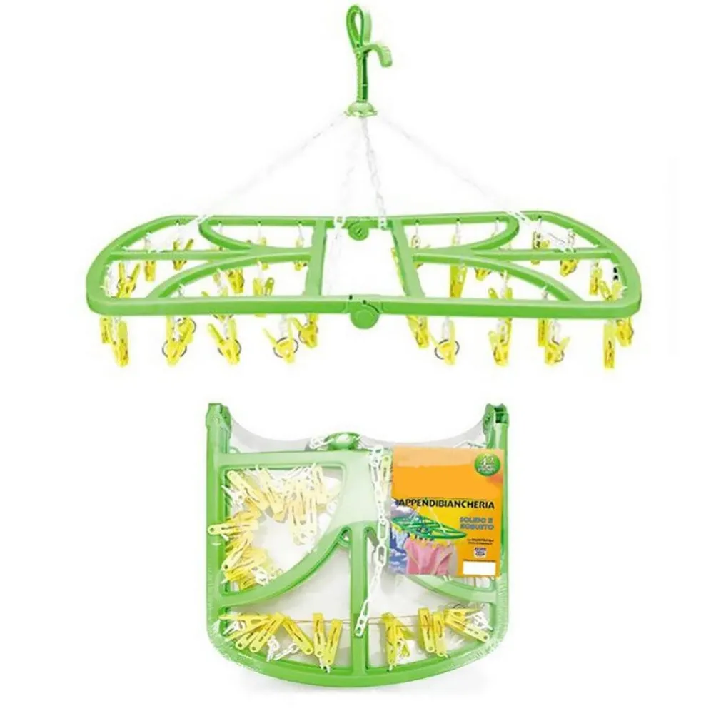 E’ la giostra appendibiancheria richiudibile a 24 pinze, per appendere e fare asciugare la tua biancheria. E’ fornito inoltre di un solido gancio, così puoi appenderlo ad un qualsiasi supporto. Realizzato in plastica dura e resistente di colore verde.