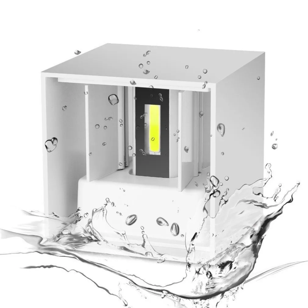 Applique da parete a led per ambienti interni ed esterni, certificato IP65, con struttura in metallo verniciato bianco ad alte temperature, quindi adatto alle intemperie. Il design si presenta come un classico cubo, a cui può essere tolto l’involucro in modo da poter regolare i fasci di luce emessi tramite le pratiche alette regolabili. Si può quindi decidere se avere un illuminazione ampia, ristretta, solo verso il basso, verso l’alto o da ambedue le parti, in modo da rendere questa applique davvero duttile e suggestiva. Il consumo è di soli 12W, grazie ai led integrati di ultima generazione che garantiscono prestazioni elevate, bassi consumi e alta affidabilità nel tempo. Il collegamento è diretto alla rete 220V, infatti l’alimentatore è già incorporato all’interno del faretto.