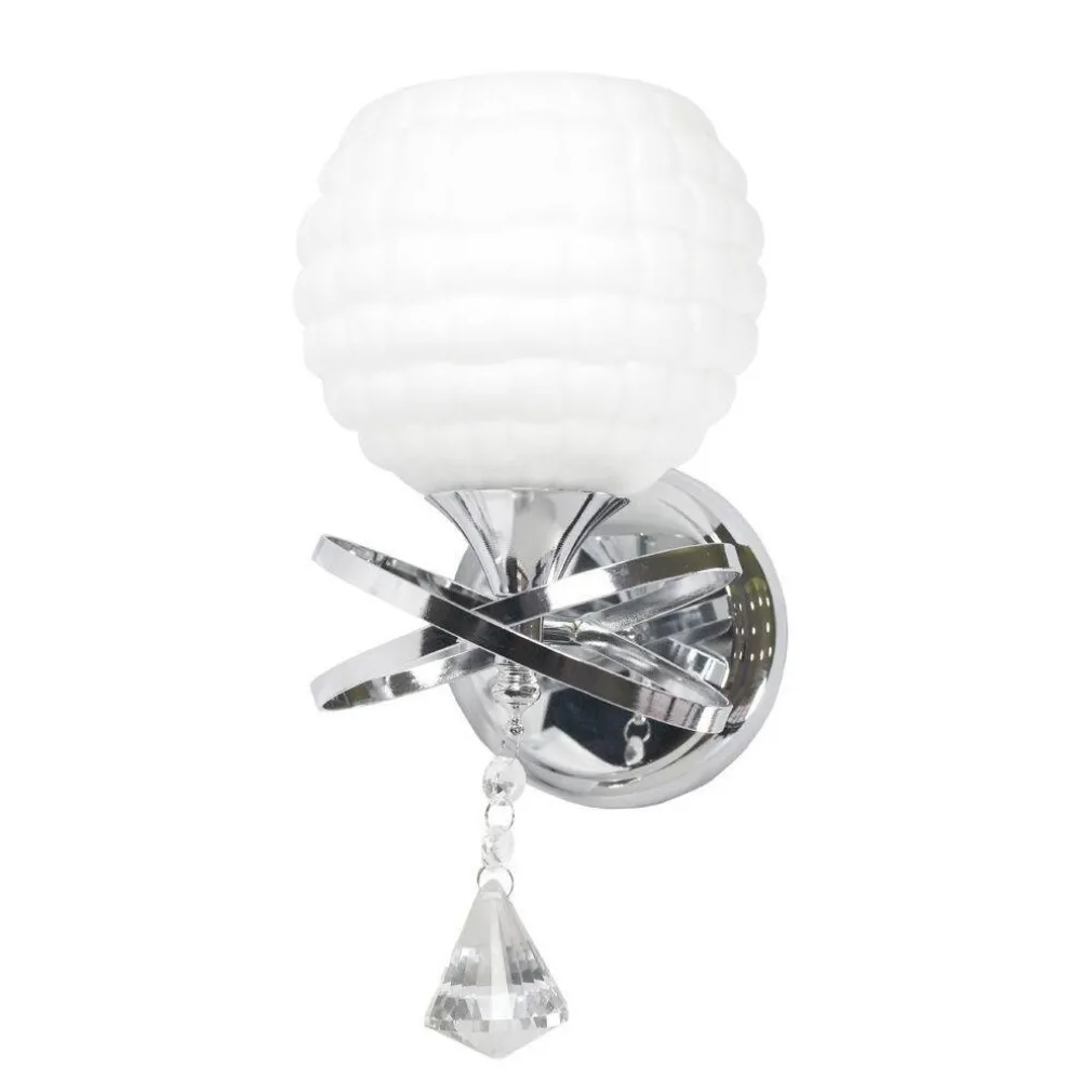 Nuova linea di applique con installazione a parete realizzati in metallo cromo lucido impreziositi con pendoli in vetro trasparenti. Paralume in vetro bianco che consente una diffusione della luce a 360° e internamente monta un portalampada per lampadine con attacco E27. Si adatta a qualsiasi tipo di arredamento sia classico che moderno.