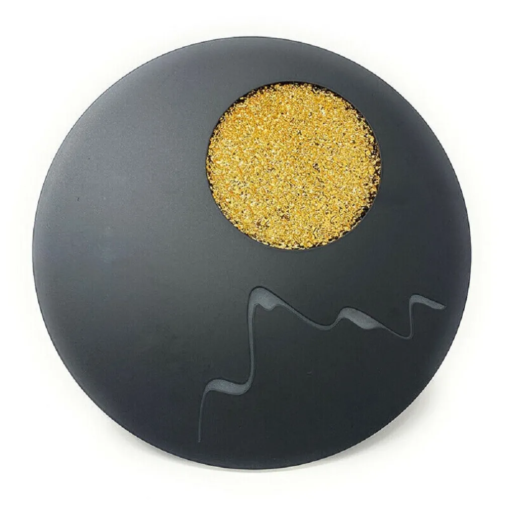 Lampada da parete moderna led raffiguranti il paesaggio di montagna con un sole color oro. Dalla forma tonda è caratterizzata da una fascia di led a luce bianca 6500K che delimitano tutta la circonferenza della lampada. Acceso crea un bellissimo effetto retroilluminato, espandendo la luce dal retro, il sole resta color oro e la linea della montagna si illumina di bianco.