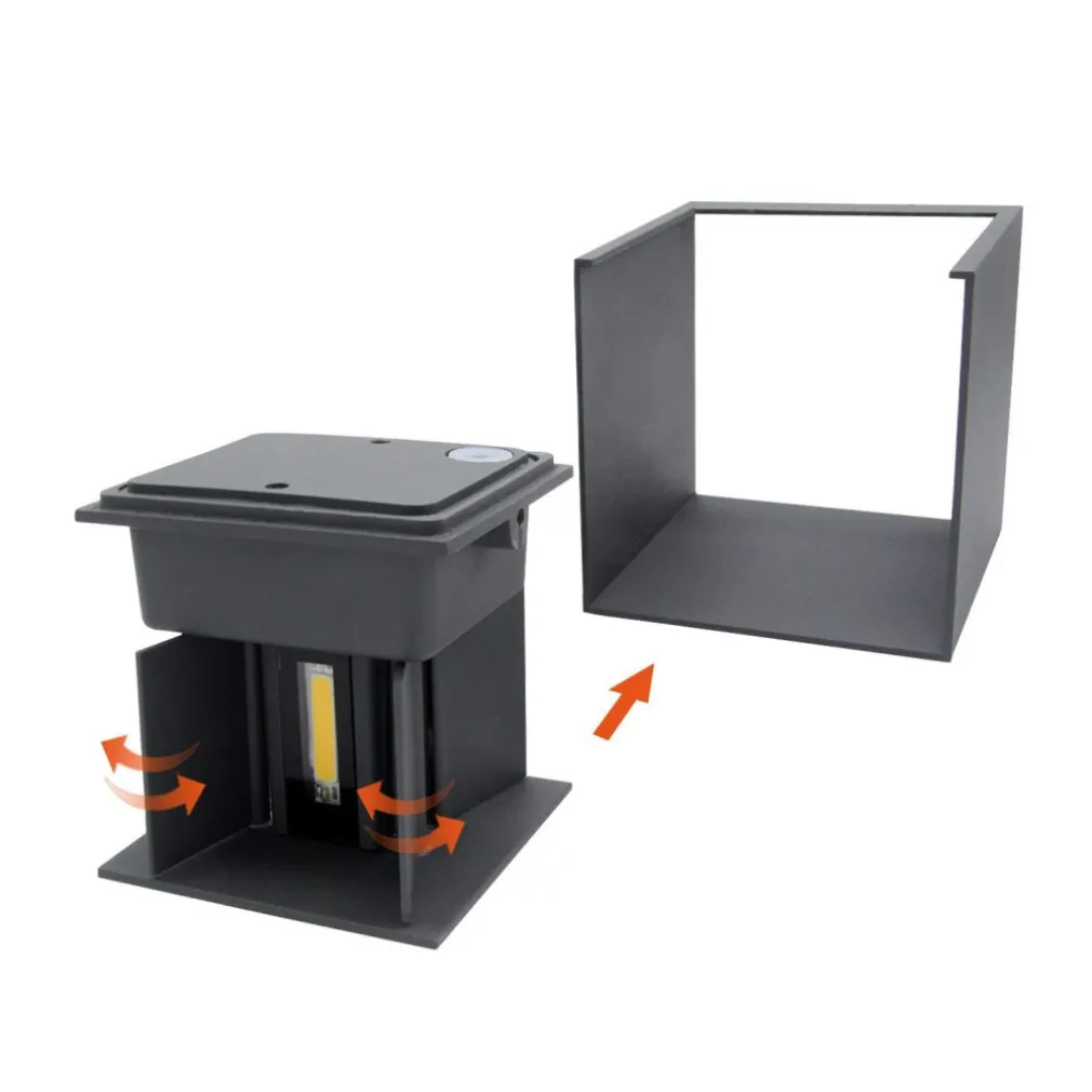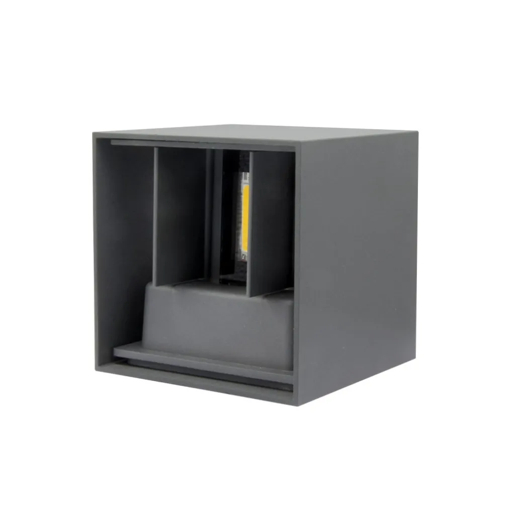 Applique da parete a led per ambienti interni ed esterni, certificato IP65, con struttura in metallo verniciato grigio ad alte temperature, quindi adatto alle intemperie. Il design si presenta come un classico cubo, a cui può essere tolto l’involucro in modo da poter regolare i fasci di luce emessi tramite le pratiche alette regolabili. Si può quindi decidere se avere un illuminazione ampia, ristretta, solo verso il basso, verso l’alto o da ambedue le parti, in modo da rendere questa applique davvero duttile e suggestiva. Il consumo è di soli 12W, grazie ai led integrati di ultima generazione che garantiscono prestazioni elevate, bassi consumi e alta affidabilità nel tempo. Il collegamento è diretto alla rete 220V, infatti l’alimentatore è già incorporato all’interno del faretto.