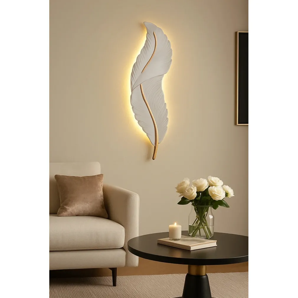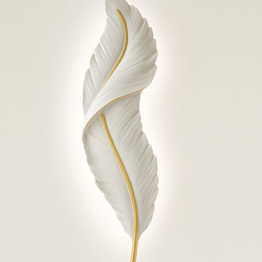 Realizzata in resina bianca con delicati dettagli dorati, questa lampada da parete a forma di piuma trasmette leggerezza visiva e classe, diventando il punto focale di qualsiasi ambiente: soggiorno, camera da letto, corridoio o ingresso.