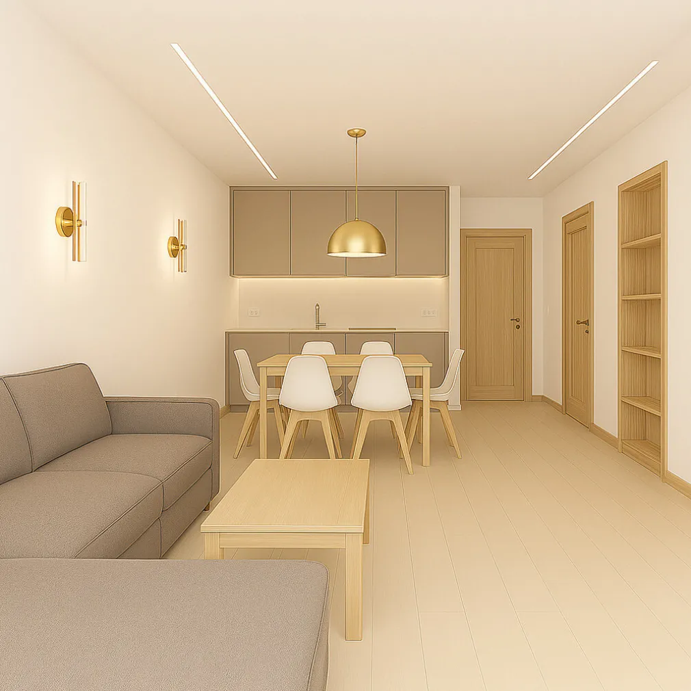 È un prodotto innovativo con luce regolabile tramite tecnologia CCT, design moderno in metallo dorato e una resa luminosa efficiente che unisce estetica e funzionalità.