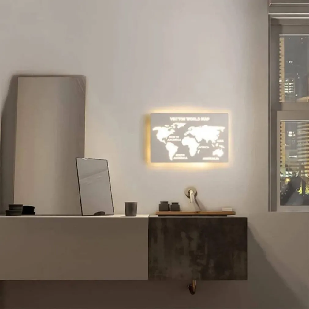 Applique a led moderno da parete rettangolare con raffigurazione del mondo planisfero. Ideale per illuminare: Camera da letto, soggiorno, ingresso e tutti quei posti dove si vuole istallare una lampada dal design moderno e innovativo. La lampada integra una fascia di led che delimita il rettangolo. Da acceso emette una luce sia sul retro che centrale illuminando tutto il mondo raffigurato. Dotata di tripla accensione a luce calda, fredda e naturale selezionabile tramite interruttore.