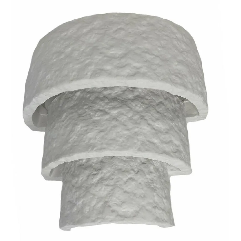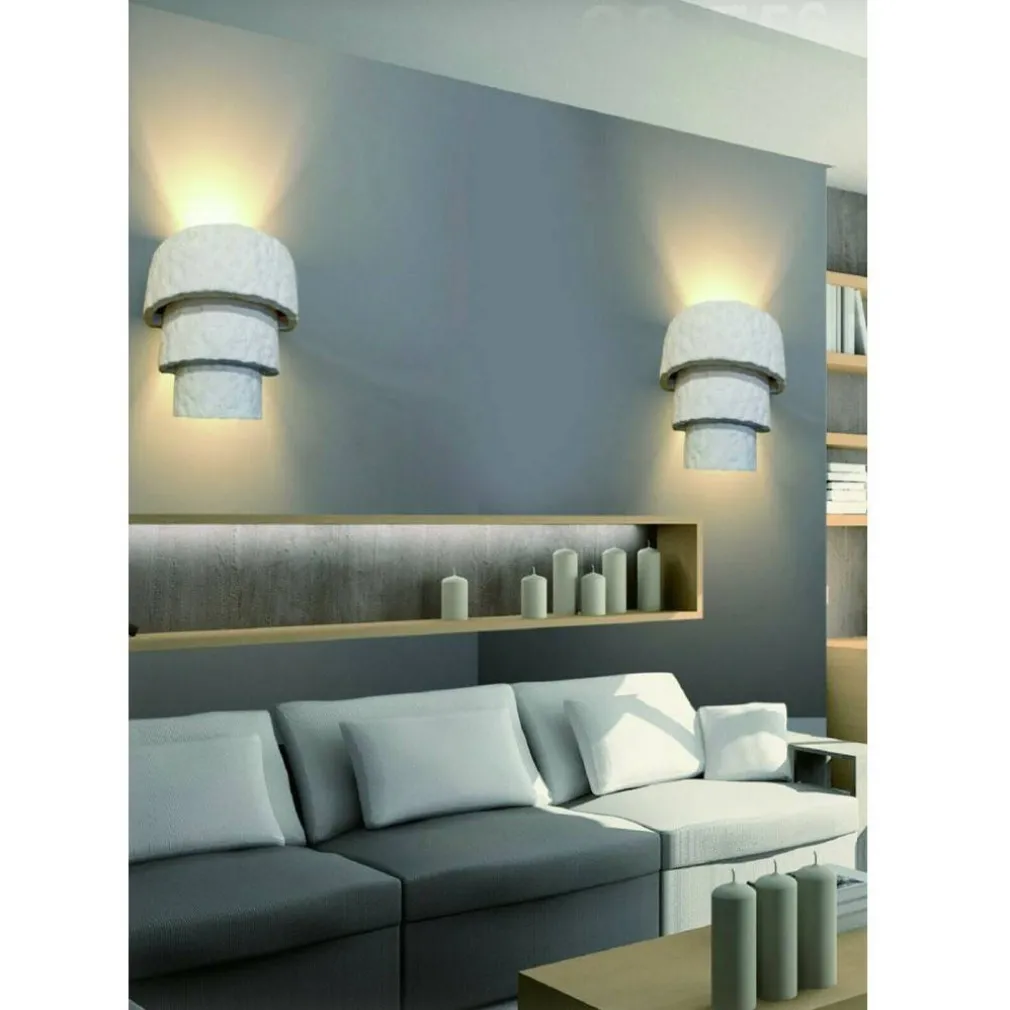 Applique da parete effetto pietra totalmente in gesso bianco verniciabile.La luce è rivolta principalmente verso il basso, ma essendo aperto il fascio luminoso esce anche dalle aperture frontali e superiori.