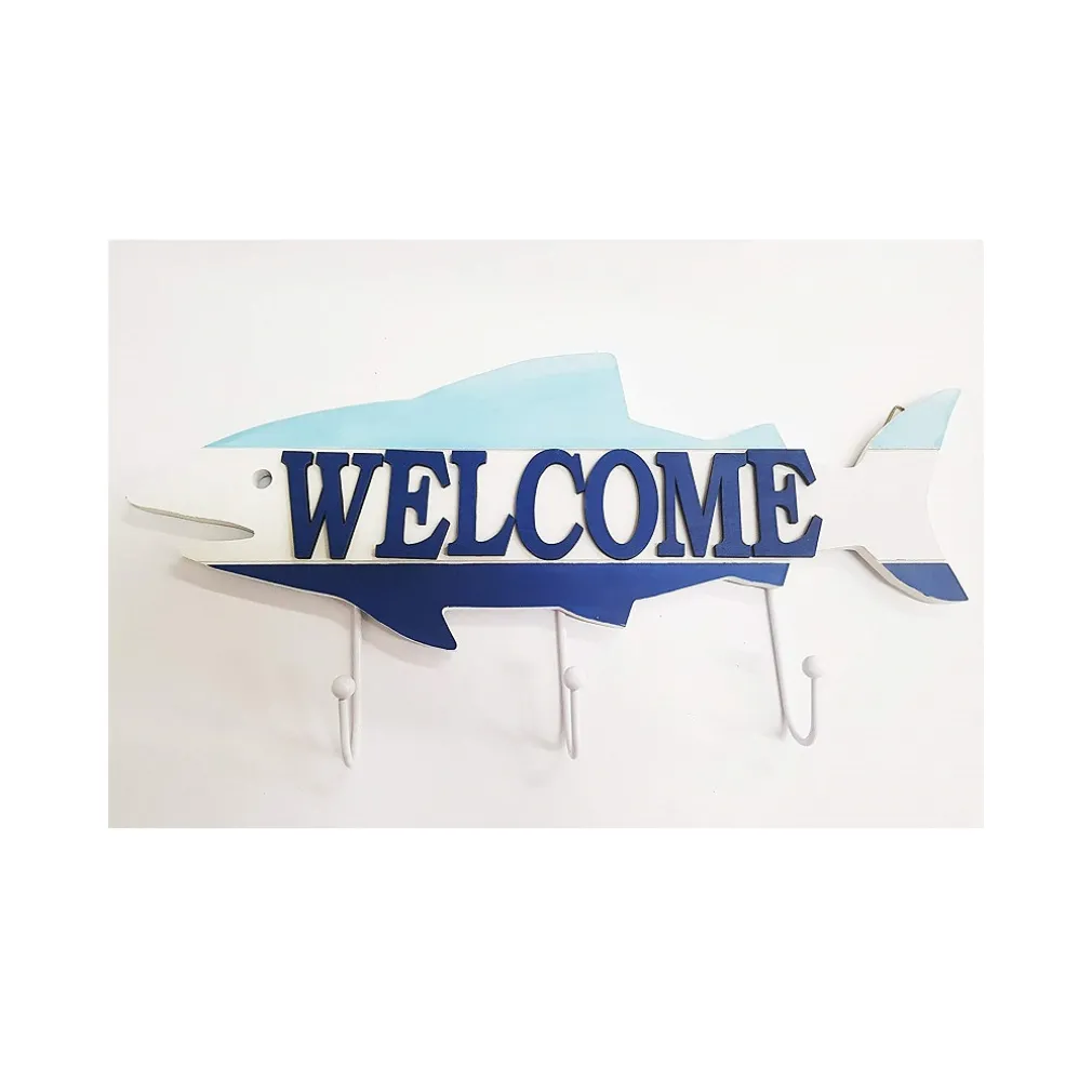 ATTACCAPANNI APPENDINO 3 GANCI DA PARETE LEGNO PESCE WELCOME GANCIO SHABBY STILE MARINO MARE DECORAZIONE DESIGN.