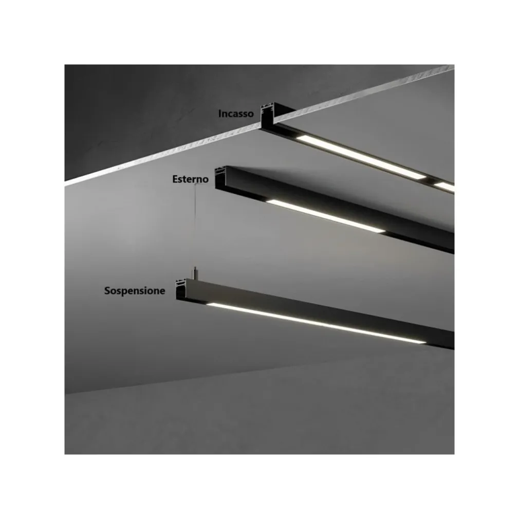 Questo binario lineare esterno può essere montato a superficie su pareti o soffitti, sia in ambienti residenziali (soggiorni, cucine, corridoi) sia in contesti commerciali (negozi, showroom, uffici, ristoranti).