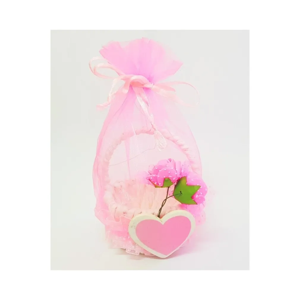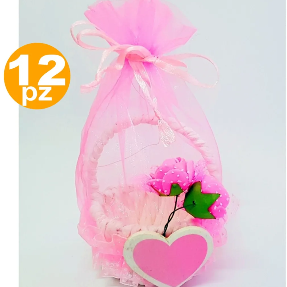 Bomboniera Cestino Rosa Cuore Sacchetto Organza Portaconfetti Nascita Battesimo – Set 12 Pezzi