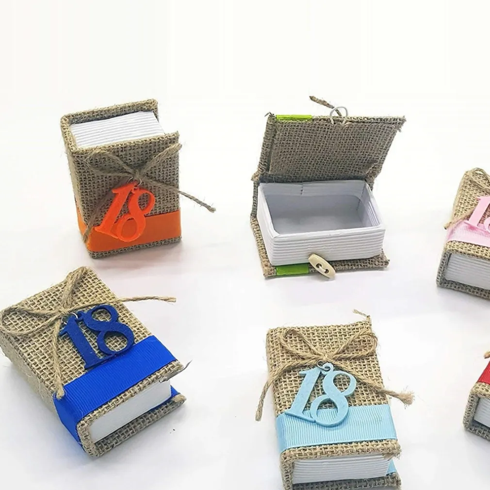 BOMBONIERA SCATOLA LIBRO 12 PEZZI JUTA 18 ANNI COLORATE BOMBONIERE PORTACONFETTI PORTA CONFETTI SCATOLINA FESTA PARTY COMPLEANNO