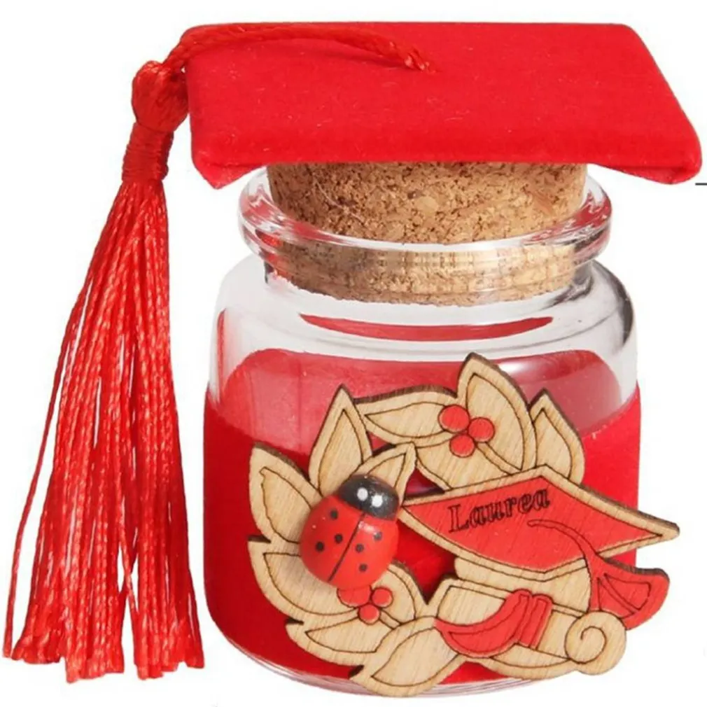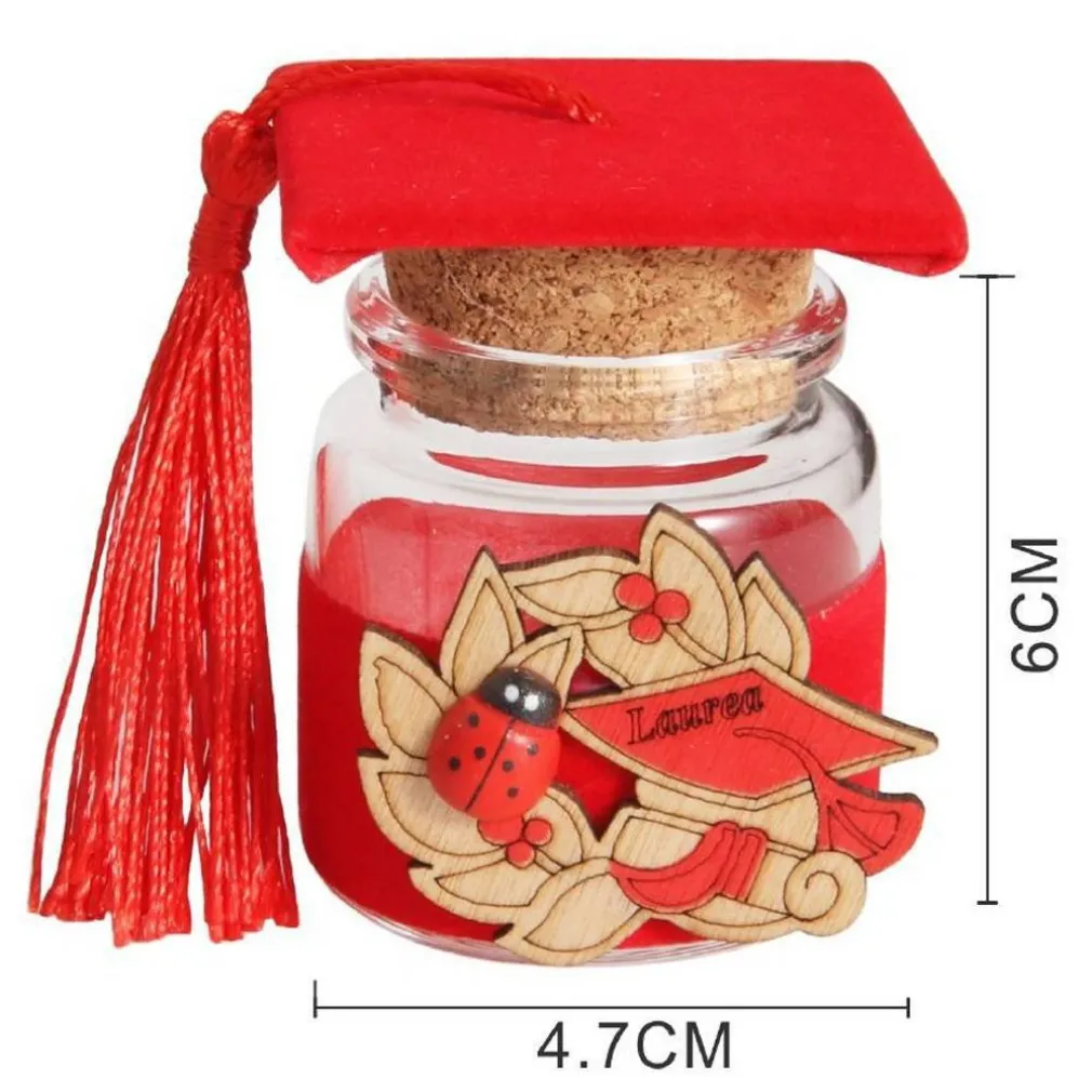 Bomboniere per festa di laurea non sono mai state così originali e affascinanti come il nostro esclusivo ampolla barattolino in vetro con decorazione tocco e coccinella portafortuna. Questa raffinata bomboniera aggiunge un tocco di classe e originalità a qualsiasi festa di laurea, riflettendo il successo e la gioia di questo importante traguardo.