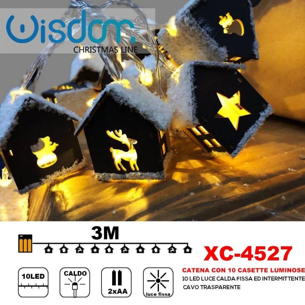 Catena Luci a LED luminosa a forma di 10 casette luminose Natalizia con alimentazione a batteria