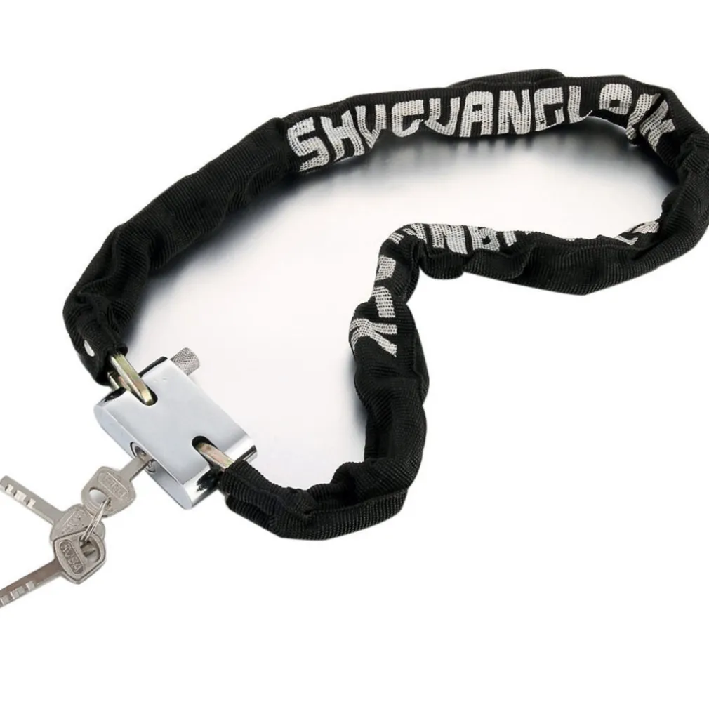 I collegamenti di questa catena blocca bicicletta o moto con un diametro di circa 6 mm e catena lunga circa 80 cm.