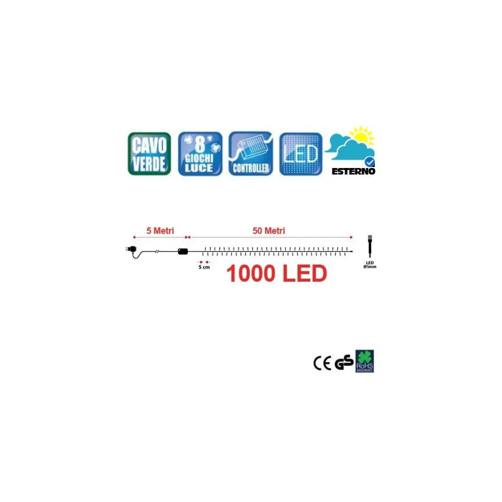 Decorare l’albero non è solo una tradizione ma una vera e propia arte. La creatività prende vita e il risultato dovrà essere straordinario! Per avere tutto ciò la luce è fondamentale e i LED rendono l’albero stupendo… da lasciare tutti senza fiato. Questa catena luminosa è dotata di 1000 LED distanti 5 centimetri tra di loro.