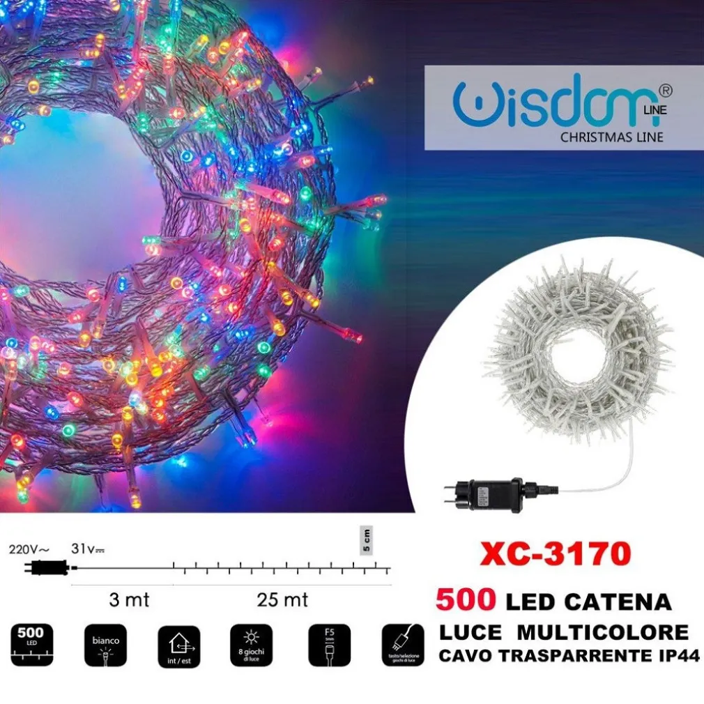 CATENA LUMINOSA 500 LUCI LED LUCCIOLE LUCE MULTICOLORE CAVO TRASPARENTE XC-3170