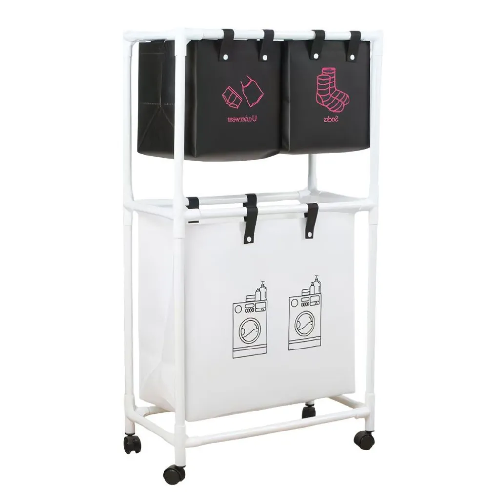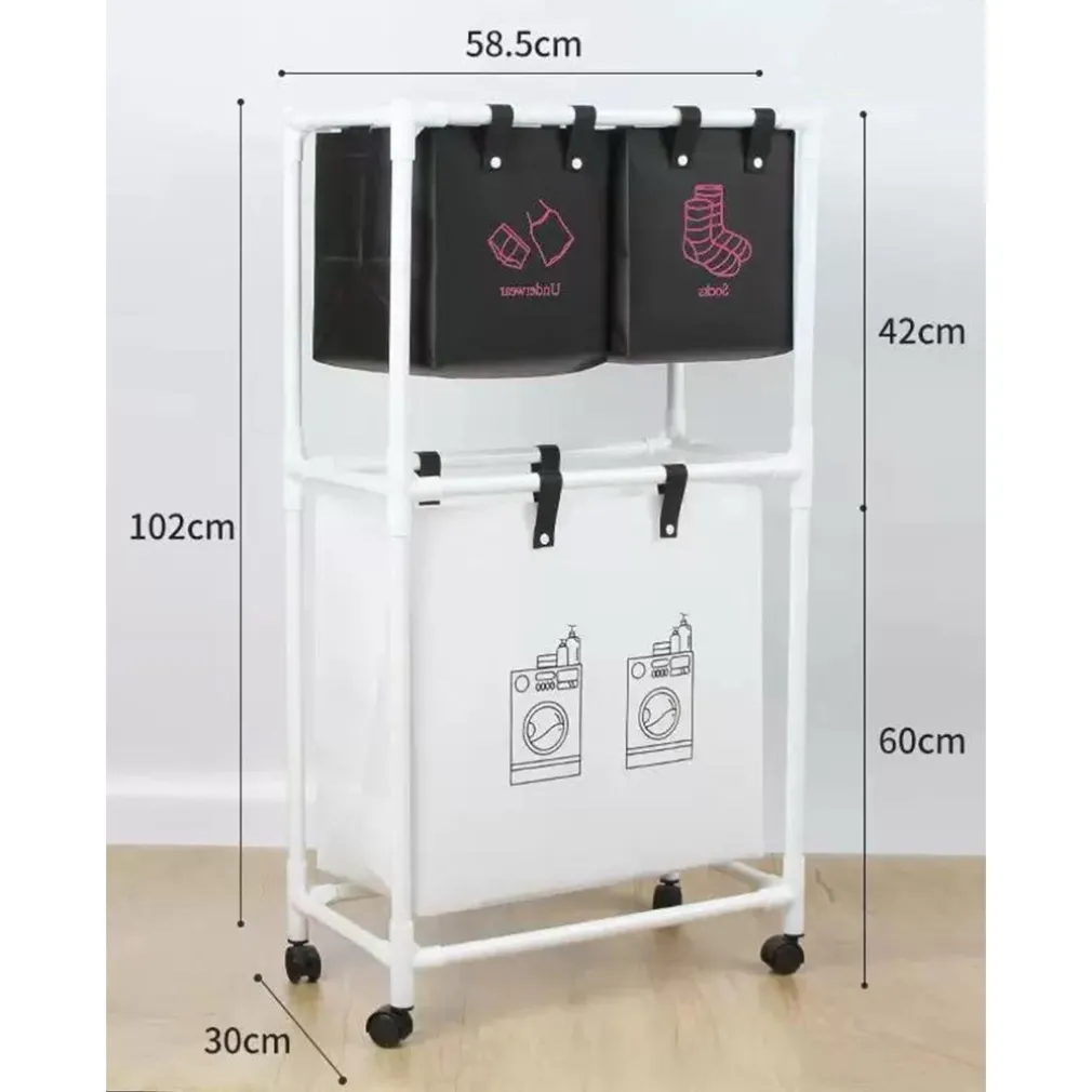 L’immagine mostra un carrello portabiancheria a due livelli con ruote e sacchetti rimovibili, progettato per separare in modo intelligente capi diversi grazie alle icone presenti sui sacchetti superiori. Le dimensioni – circa 58,5 cm di larghezza, 30 cm di profondità e 102 cm di altezza totale – lo rendono compatto ma estremamente capiente, perfetto per qualsiasi ambiente domestico.
