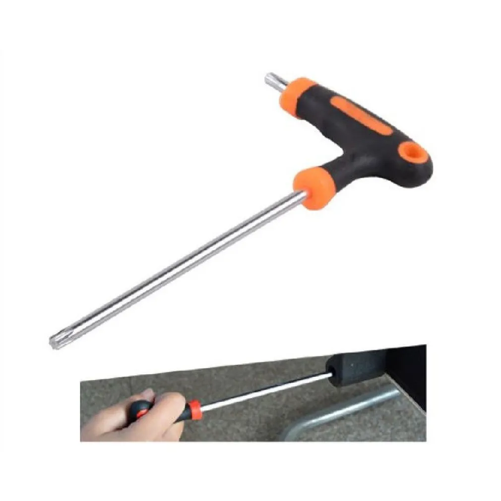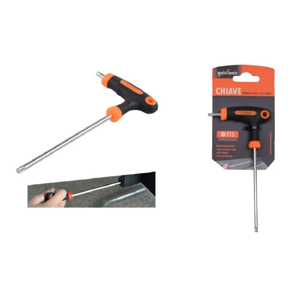 Chiave con impugnatura di manovra. Realizzate in acciaio cromo vanadio queste brugole sono perfette anche per i professionisti che necessitano di una qualità elevata. L’accurato proporzionamento dell’impugnatura ergonomica, in funzione della dimensione della chiave, garantisce serraggi elevati anche in spazi ristretti. Chiavi a T con punta a stella e impugnatura ergonomica.