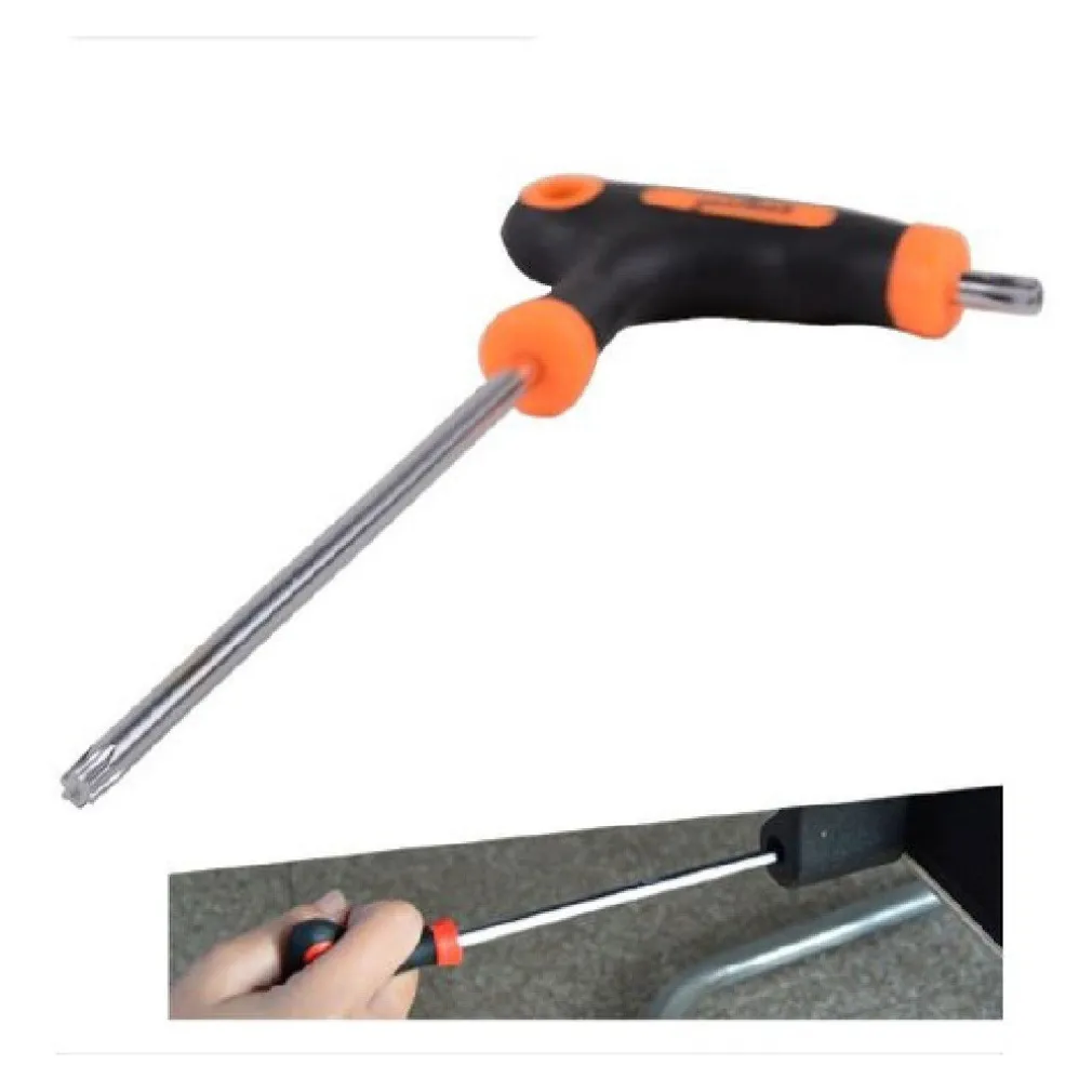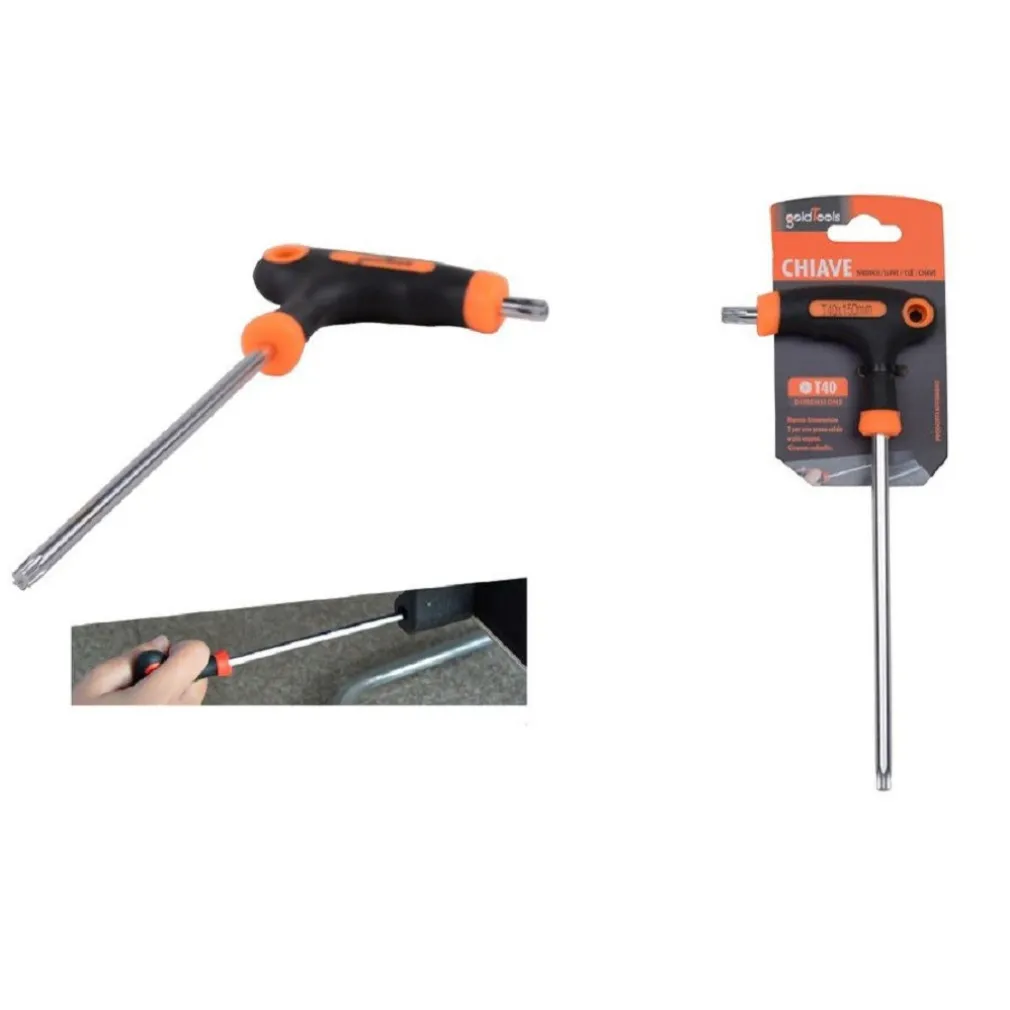 Chiave con impugnatura di manovra. Realizzate in acciaio cromo vanadio queste brugole sono perfette anche per i professionisti che necessitano di una qualità elevata. L’accurato proporzionamento dell’impugnatura ergonomica, in funzione della dimensione della chiave, garantisce serraggi elevati anche in spazi ristretti. Chiavi a T con punta a stella e impugnatura ergonomica.
