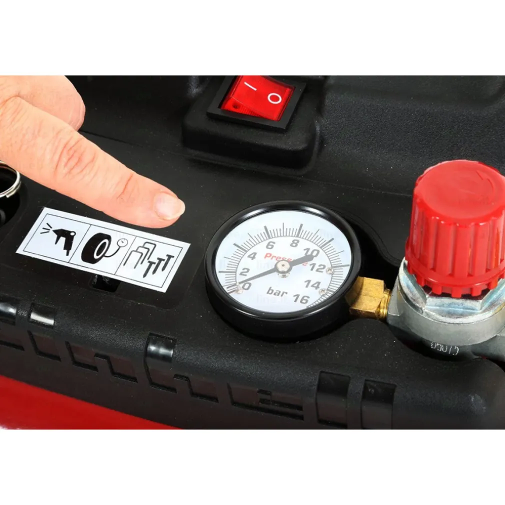 Inoltre la Einhell garantisce il serbatoio per 10 anni contro i danni causati dalla ruggine depositata sulle pareti. Forma compatta, particolarmente piacevole alla vista, il compressore Einhell TH-AC 190/6 OF è lo strumento migliore che puoi scegliere per eseguire tanti piccoli lavori per la tua casa che quotidianamente ti si possono presentare. La forma compatta, le dimensioni ridotte e la maniglia incorporata alla struttura ti permettono di spostare l’attrezzo e utilizzarlo ovunque tu ne abbia bisogno: ti sarà sufficiente collegarlo ad una presa di corrente elettrica domestica; una volta a riposo puoi avvolgere il cavo elettrico ai tre agganci posteriori per avere il compressore sempre in ordine. Spostando il tasto di accensione sulla posizione “I” dai l’avvio al compressore. Grazie alla legenda riportata sul serbatoio puoi controllare le caratteristiche principali del compressore e capire immediatamente se è l’attrezzo giusto che fa per te. Il manometro per il controllo della pressione interna al serbatoio ti consente di verificare istantaneamente il livello durante ogni fase dell’utilizzo. La manopola di colore rosso posta all’uscita dell’aria, regola il volume in uscita che potrai regolare ruotandola in senso orario. Grazie alla valvola di spurgo potrai effettuare la pulizia periodica del serbatoio: a fine lavoro, quando il serbatoio ha ancora un po’ di aria all’interno, ti sarà sufficiente aprirla e lo sporco depositato sulle pareti, uscirà con una leggera pressione all’esterno; in questa maniera avrai il compressore efficiente per lungo tempo. L’attacco dell’uscita aria è universale, ad aggancio rapido, adatto per utilizzare molti utensili ed effettuare tanti lavori: gonfiare, soffiare e verniciare con l’aerografo non saranno più un problema.