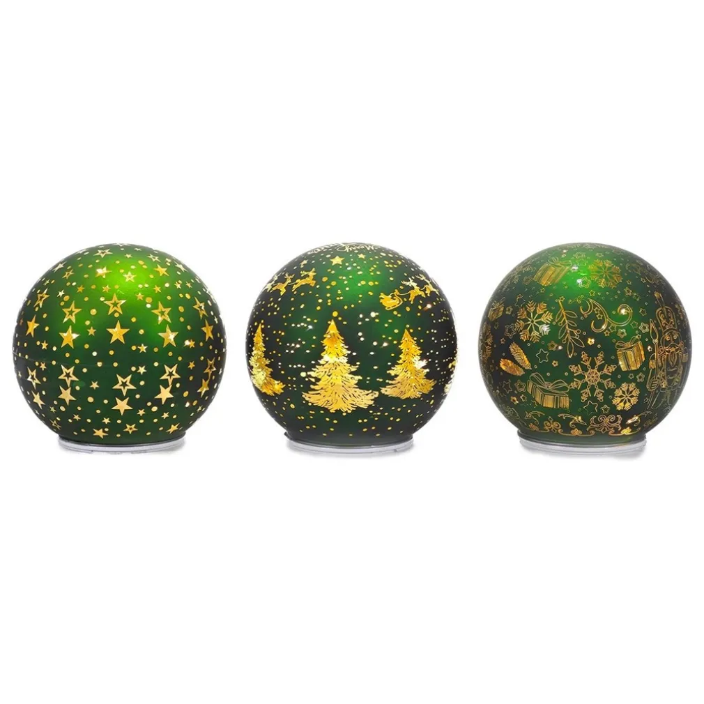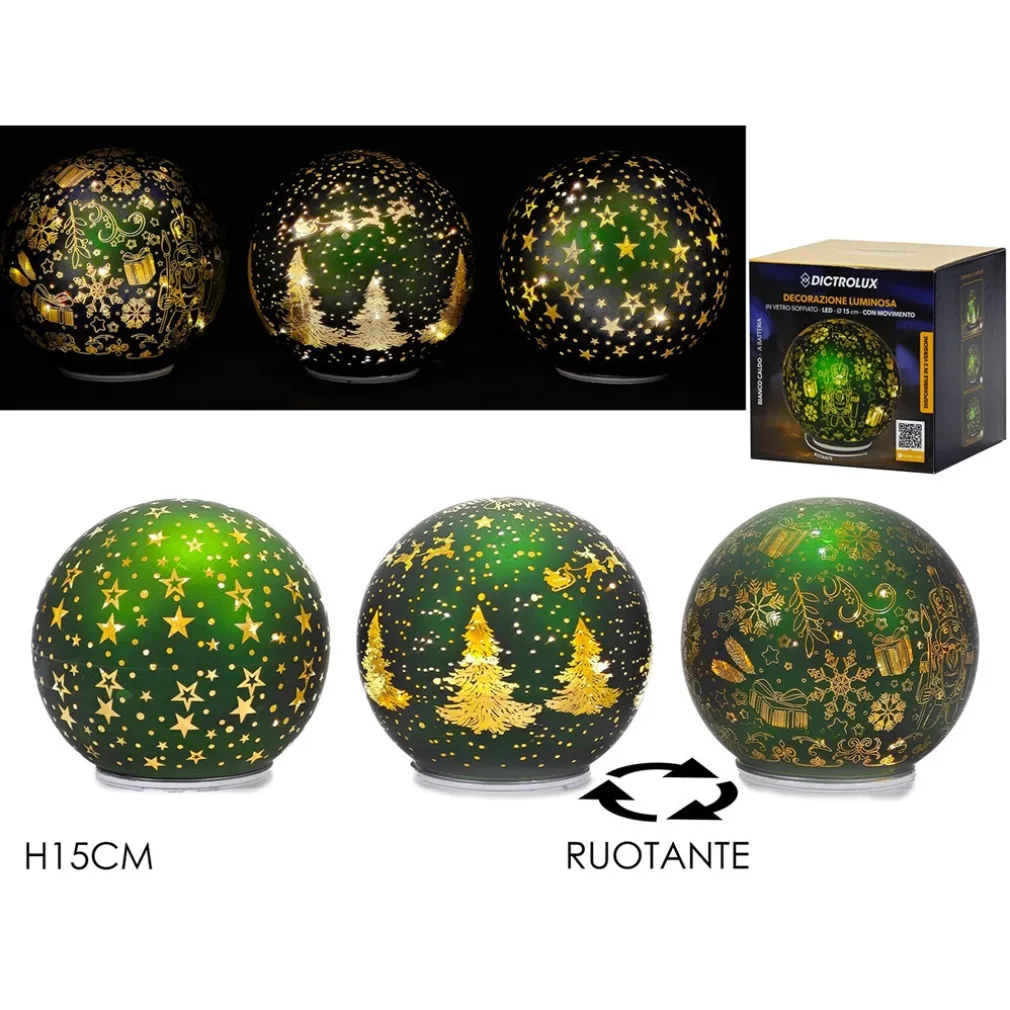 La decorazione natalizia luminosa a led bianco caldo in vetro soffiato è un complemento raffinato, pensato per chi desidera vivere il Natale con gusto. Realizzata interamente in vetro soffiato di alta qualità, presenta un design verde impreziosito da dettagli dorati raffiguranti stelle, fiocchi di neve, alberi e pacchetti regalo. Il meccanismo rotante interno crea un affascinante movimento che diffonde riflessi caldi e scintillanti, trasformando qualsiasi stanza in un ambiente accogliente, elegante e ricco di atmosfera.