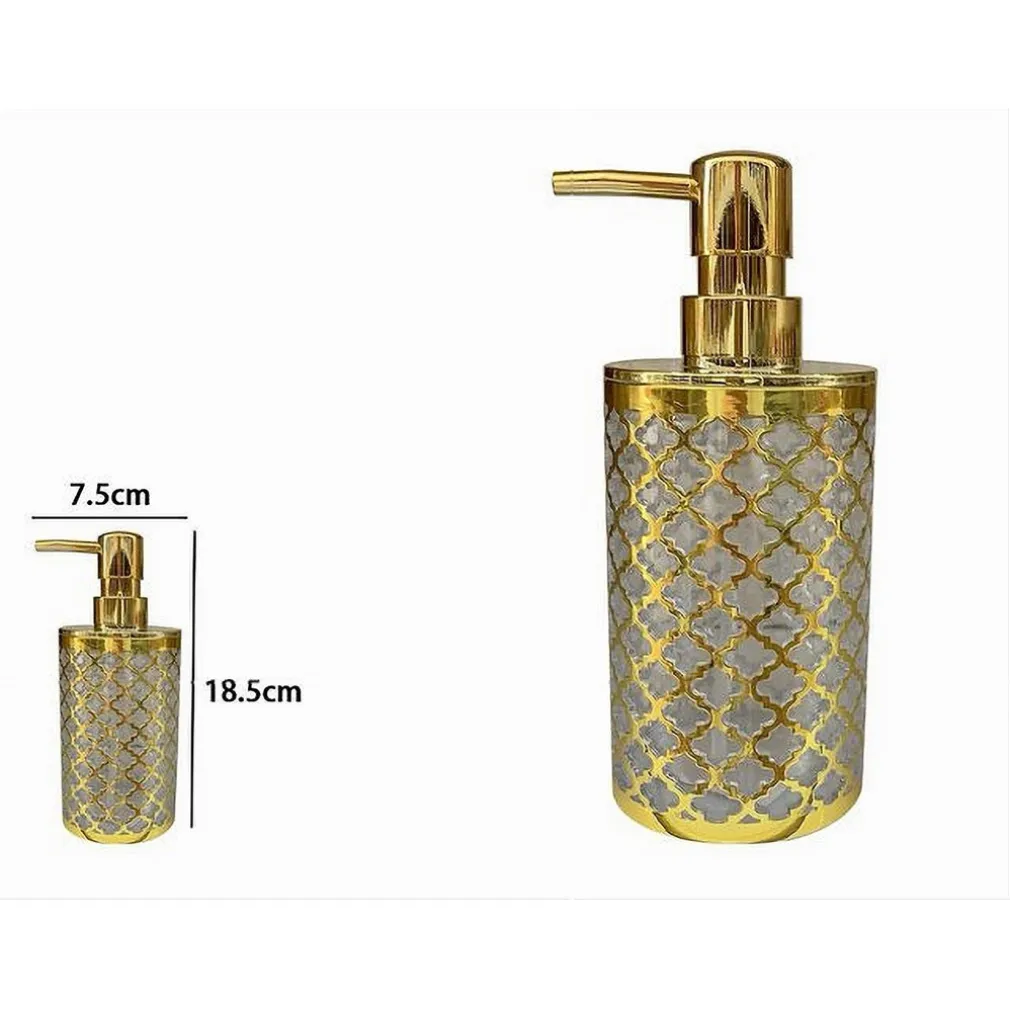 È un accessorio per il bagno che permette di dosare il sapone liquido in modo elegante e funzionale. Realizzato in ABS con un raffinato effetto traforato in oro, si adatta perfettamente a qualsiasi stile di bagno, sia moderno che classico.