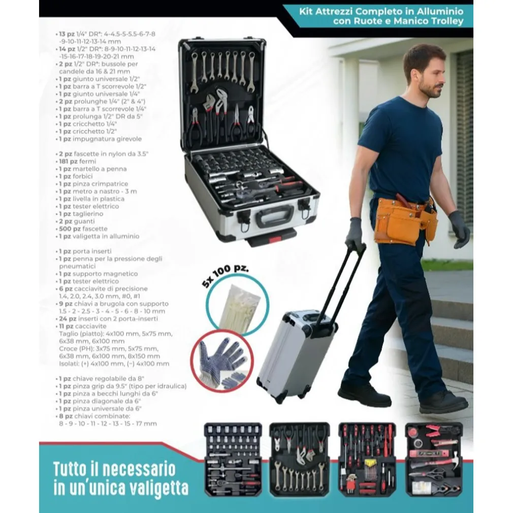 KIT ATTREZZI VALIGETTA PROFESSIONALE 799PZ TROLLEY ALLUMINIO CON RUOTE COMPLETO FAI DA TE
