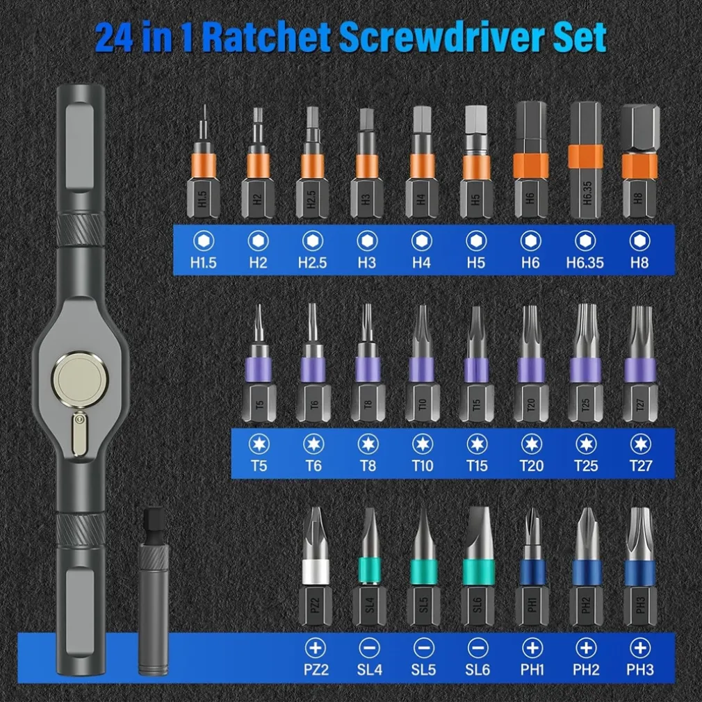 KIT CACCIAVITI A CRICCHETTO 24IN1 DI PRECISIONE CON 24 PUNTE MANICO RIMOVIBILE – Riparazioni Professionali e Fai-da-Te