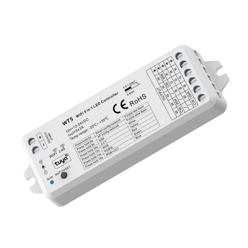 La centralina SMART si alimenta a 12V/24V e consente di gestire il pannello tramite Wi-Fi utilizzando l’APP Tuya o tramite gli assistenti vocali Amazon Alexa e Google Home, oppure associandola ad un telecomando o pannello a muro in RF 2.4G. La sincronizzazione avviene tramite pulsante presente sulla centralina. La centralina è dotata di 5 canali supporta un carico massimo per canale di 3A (Totale corrente: 15A). Ha una potenza di 36W / 72W (180-360W potenza totale). Inoltre è presente un LED che a seconda del colore indica il tipo di modalità scelta.