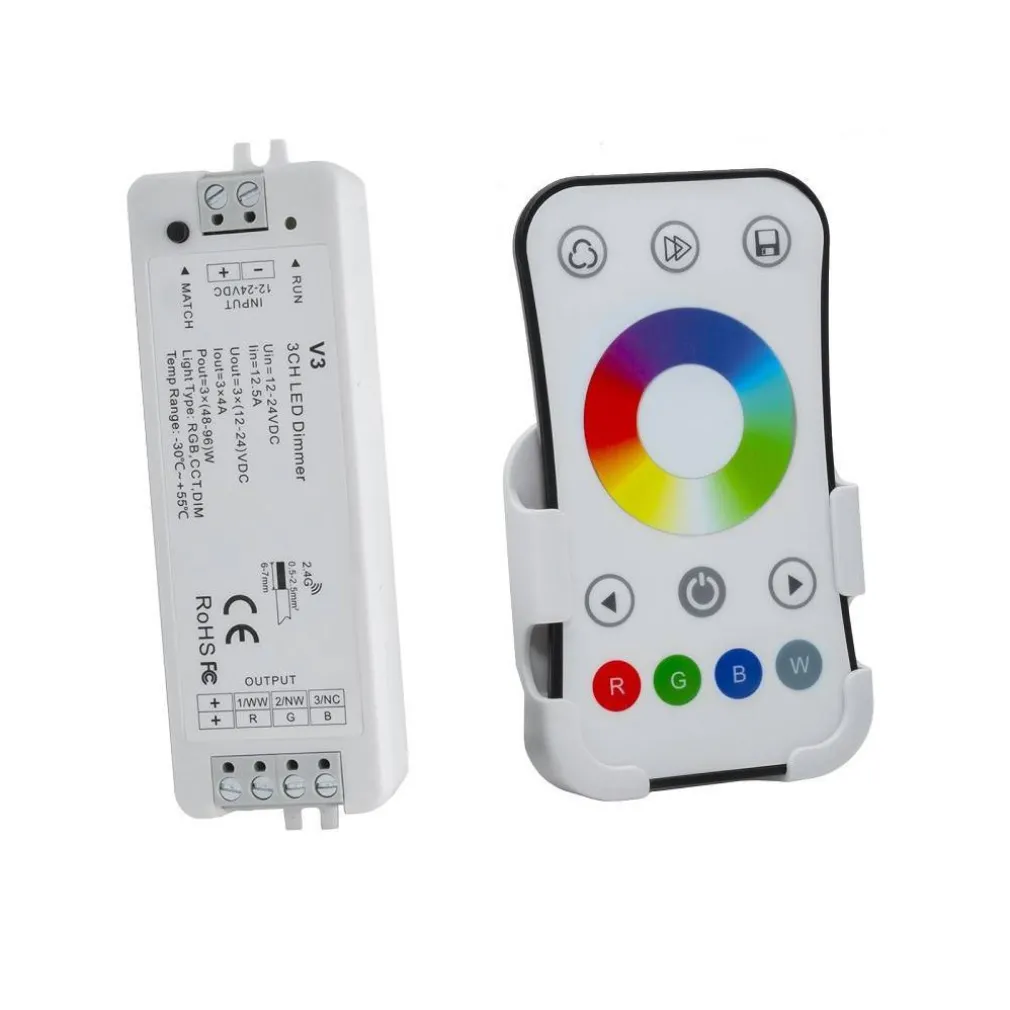 - Il controller lavora in radiofrequenza RF 2.4Ghz quindi dunque non è necessario puntare il telecomando verso il controller ma funzionerà da qualsiasi punto nelle vicinanze anche se il controller è nascosto o racchiuso in scatole di derivazione. Il raggio di azione è di circa 30 metri.