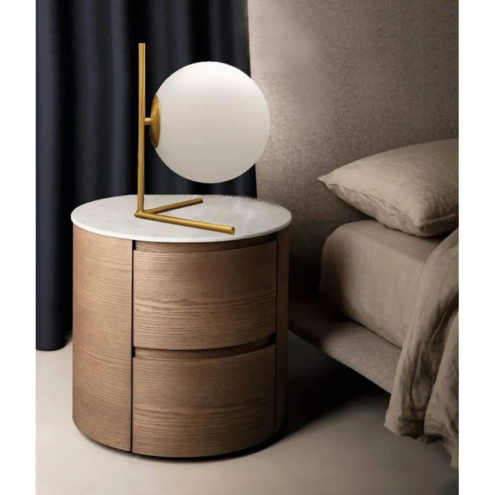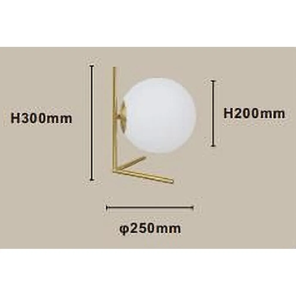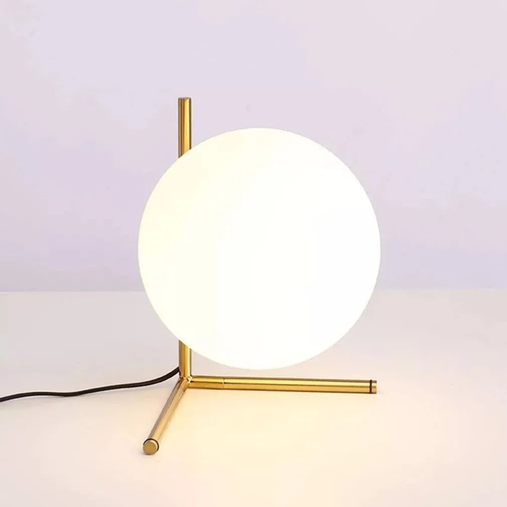 - Lampada da tavolo in metallo dorato satinato con sfera in vetro bianco opaco.