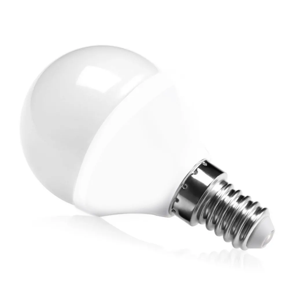 Lampadina LED 3W E14 minisfera in materiale Plastico . Led SMD con Fascio luminoso di 200° e flusso luminoso di 240 lm. La potenza di 3W è equivalente a 27 W di un faretto ad incandescenza.