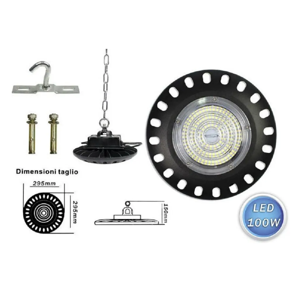 Lampada led industriale di ultima generazione ad alta luminosità. Realizzata in alluminio pressofuso resistente agli urti, con un pannello in plastica trasparente a protezione dei led. Va montata direttamente a 220V. La catena e il materiale per la sospensione sono inclusi. Classe energetica A+, risparmio fino al 90% rispetto a una lampada tradizionale.