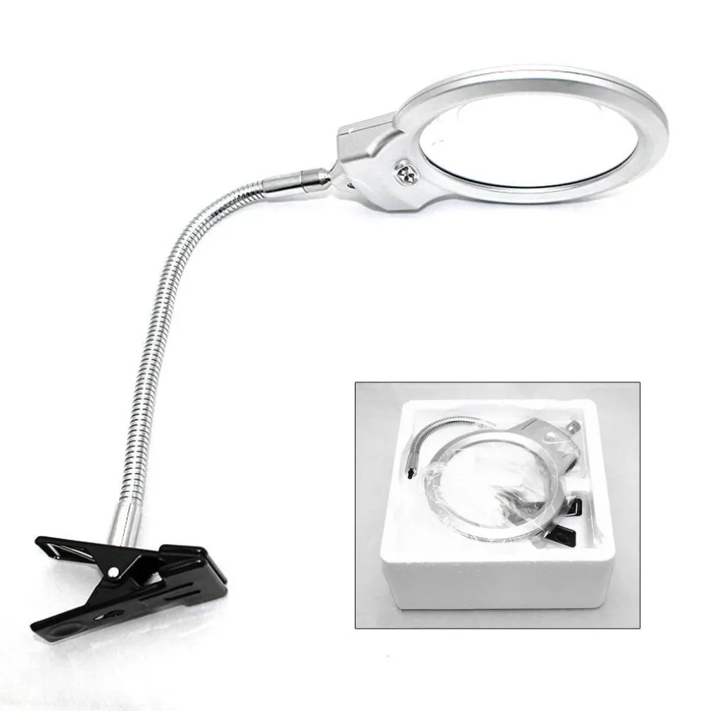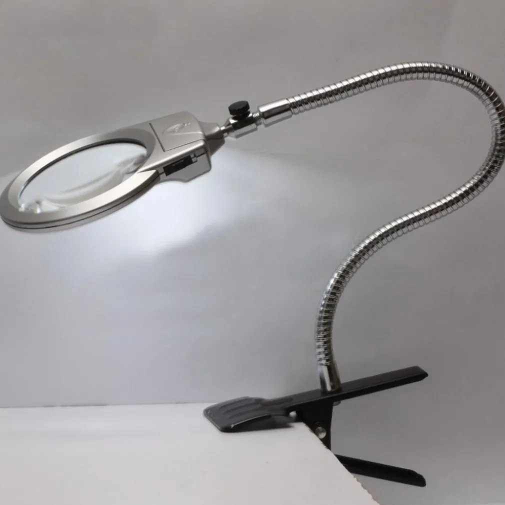 Lampada con lente da tavolo d’ingrandimento con clip per aggancio al banco, professionale e luce LED con 2 mini led con luce bianca, ideale per lavori di precisione e doppio ingrandimento 2x e 5x.