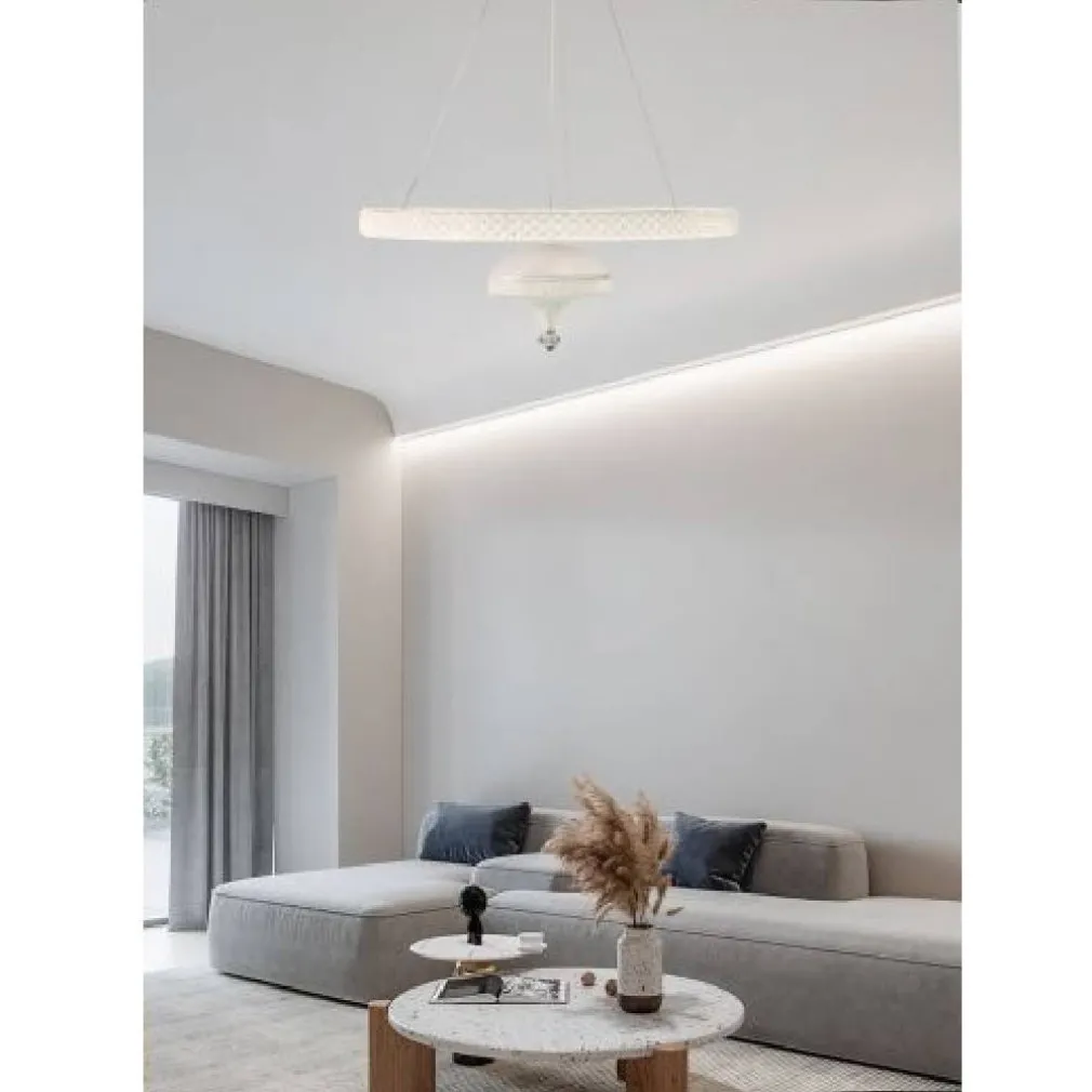 Lampadario a sospensione LED 50W anello sospeso effetto cristallo. Elegante e raffinato, dal design moderno con anello sospeso in acrilico effetto cristallo e paralume sospeso, regola l’altezza per creare giochi di luce. Arreda i tuoi spazi con uno stile unico e ricercato. Il lampadario è realizzato in lega di alluminio e PC, leggero e durevole. I materiali e la manifattura di alta qualità rendono il lampadario resistente, bello, elegante e facile da pulire. Il suo sistema a LED diffonde la luce in maniera uniforme e crea un ambiente confortevole. Il suo design unico si adatterà facilmente al tuo arredamento, donandovi un tocco di originale modernità. Perfetto per salone, cucina, open space ed ambienti raffinati. Grazie ai LED a risparmio energetico avrai un’illuminazione maggiore con consumi più bassi.