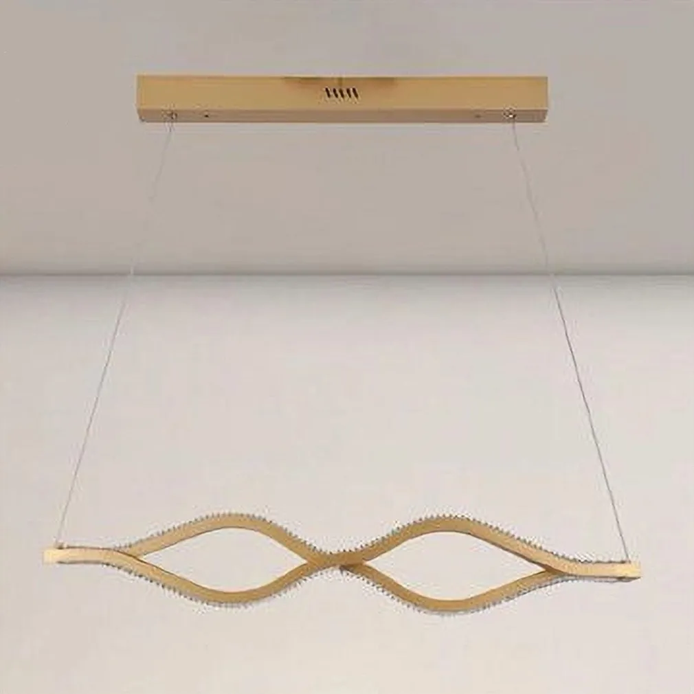 È un lampadario sospeso con illuminazione LED ad alta efficienza energetica, caratterizzato da un design moderno con dettagli effetto cristallo ondulato in finitura oro. Perfetto per chi desidera unire estetica e tecnologia.