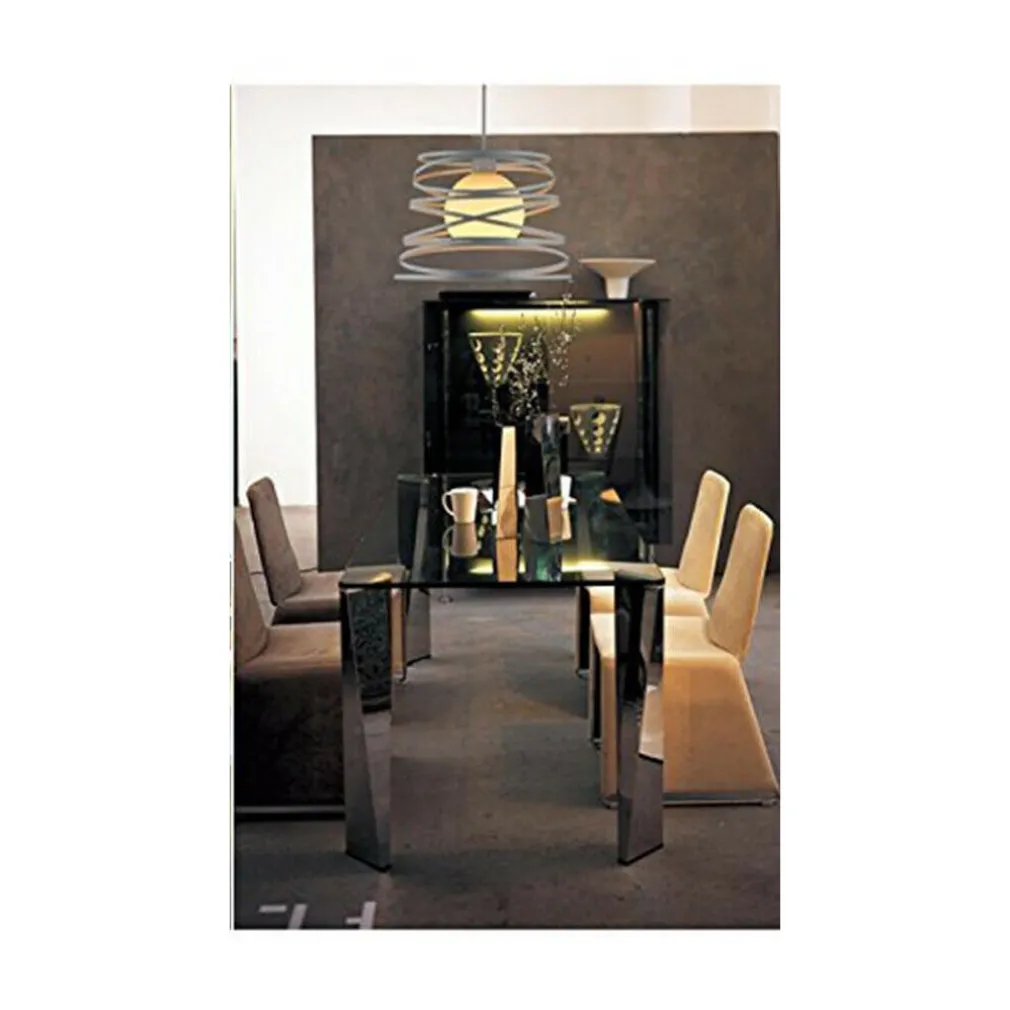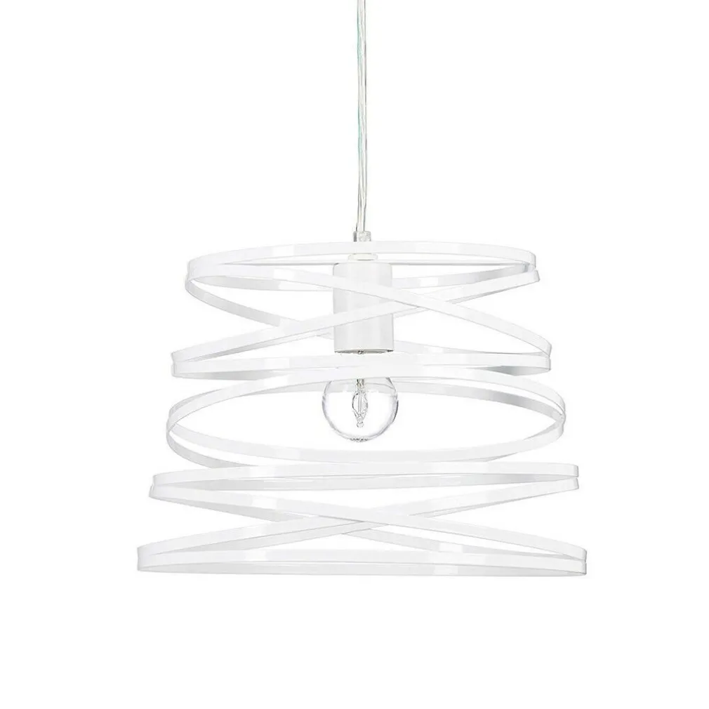 Lampada ultramoderna a sospensione con nastri in metallo che vanno a creare un paralume dall’impatto scenico unico e contemporaneo. Ideale per illuminazione di snack, angoli bar, banconi e cucine. Monta un portalampada con attacco per lampadine E27 max 60w (non inclusa). Composto da nastri in metallo avvolti a vortice che formano un paralume traforato per un emissione di luce a 360°.