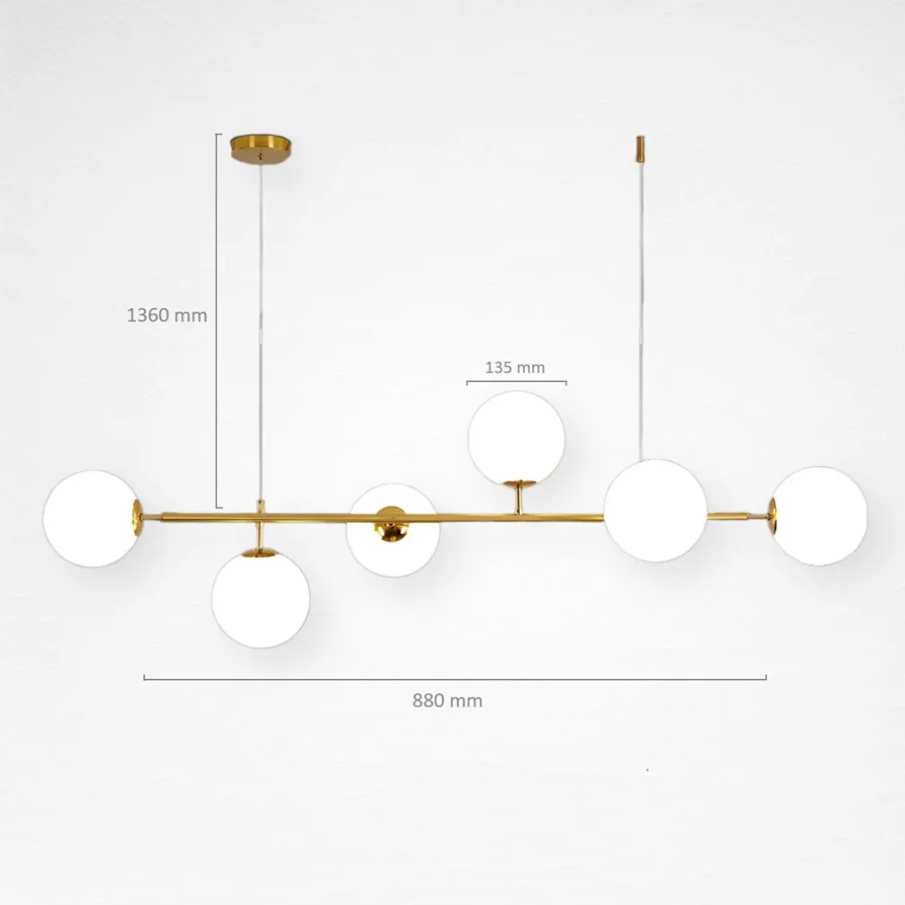 Quali sono le caratteristiche tecniche principali? Il lampadario ha una struttura in alluminio oro satinato e sfere in vetro bianco opaco. Supporta lampadine con attacco G9 (lampadina non inclusa) ed è protetto con grado IP20, rendendolo adatto solo per uso interno. La lunghezza dei fili è regolabile fino a 136 cm, mentre la larghezza totale con le sfere montate raggiunge i 115 cm.