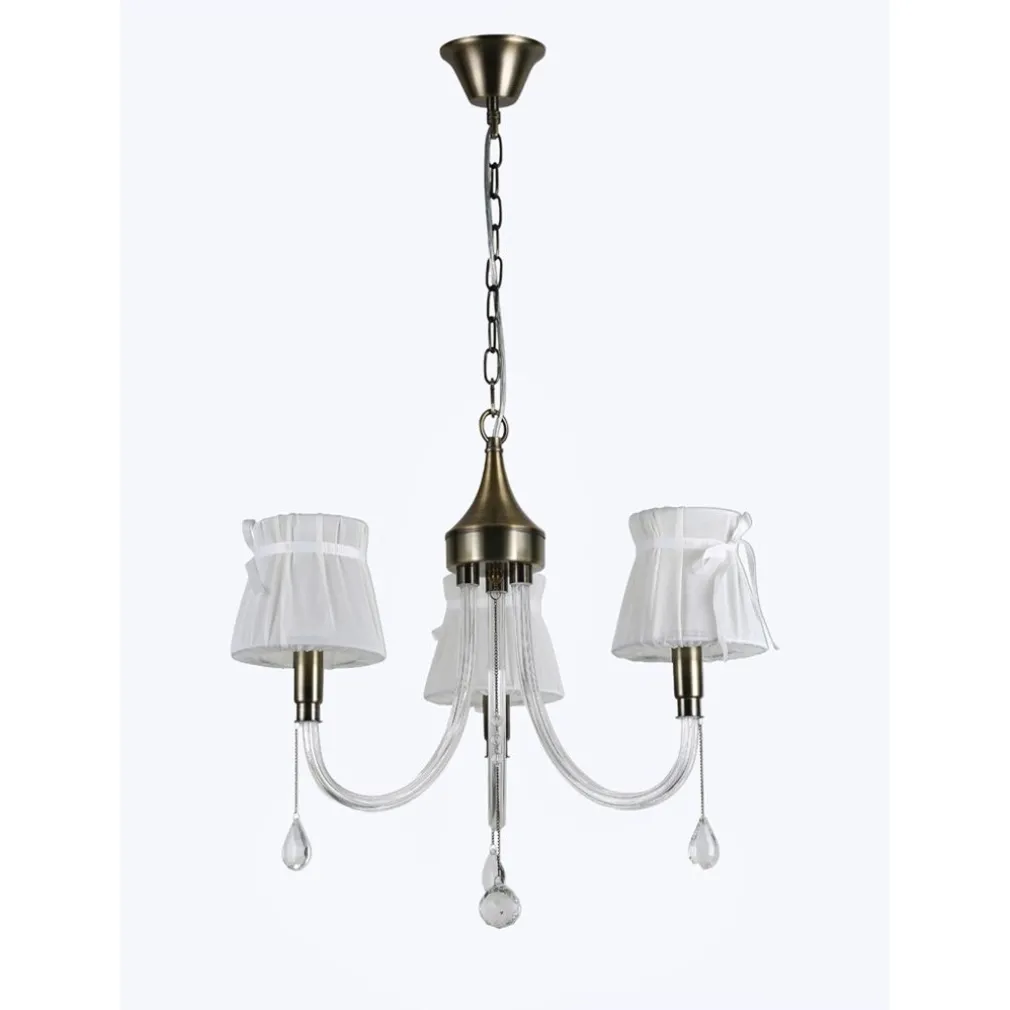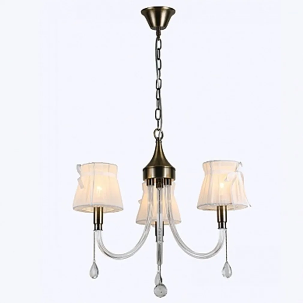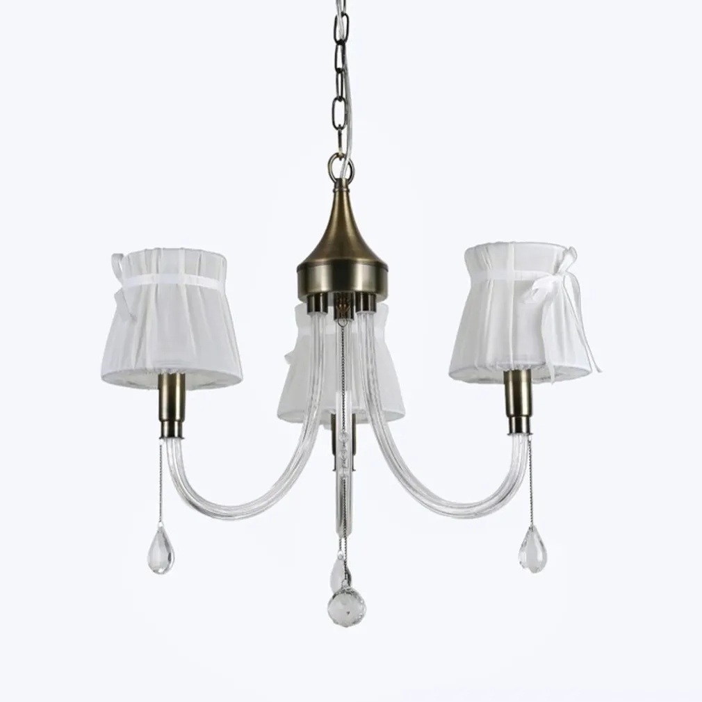 Il design classico con rifiniture in bronzo e i dettagli in tessuto bianco decorativo, insieme ai cristalli pendenti, creano un’illuminazione unica che valorizza ogni ambiente con eleganza.