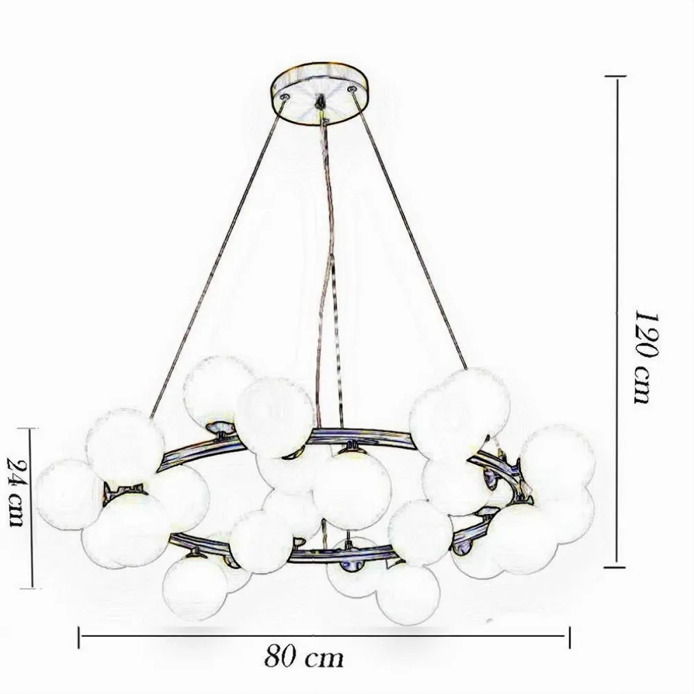 Composto da una robusta struttura in metallo di colore bronzo, il lampadario è dotato di 25 diffusori in vetro bianco opaco che garantiscono un’illuminazione omogenea e diffusa, creando un’atmosfera calda e invitante. La lunghezza dei cavi è regolabile, offrendo così la massima flessibilità nella personalizzazione dell’altezza del lampadario secondo le tue esigenze.
