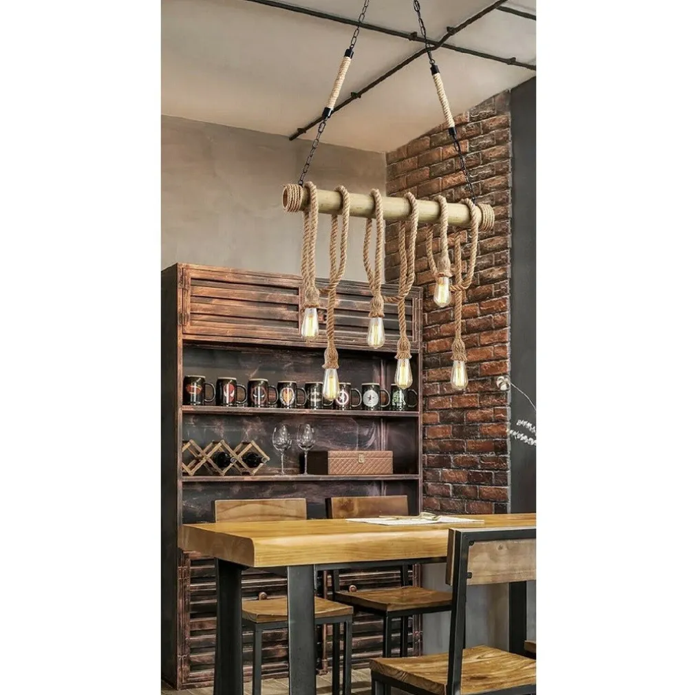 Lampadario a sospensione dal design rustico con corda in canapa perfetto per arredare casa con originalità. Dotato di 6 portalampada con attacco E27, perfetto per casa, bar, pub, ristoranti, ecc.
