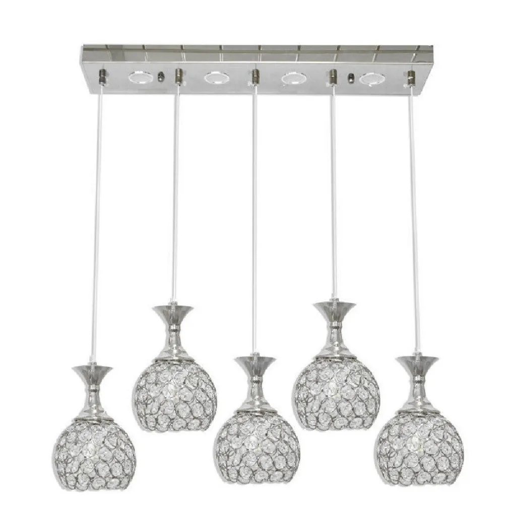 Lampadario sospeso a led dal design moderno e innovativo con 5 sfere con portalampada attacco g9 perfetto per conferire un tocco di originalità alla tua casa. È possibile regolare la lunghezza delle corde così da creare un gioco di altezze. Sulla base sono inseriti faretti dalla potenza di 5 watt ciascuno. Disponibile in due diverse colorazioni: argento o oro.