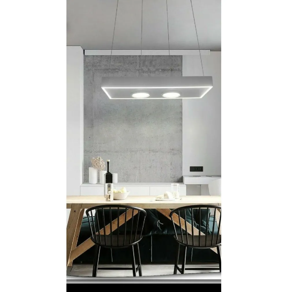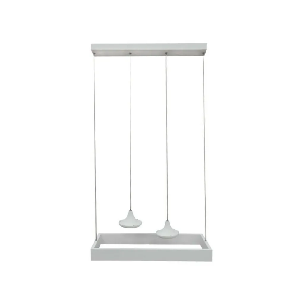 Lampadario da soffitto a led dal design minimale e moderno e dalla forma rettangolare, perfetto per conferire un tocco di originalità al tuo arredamento. Costituito da un rettangolo con bordo illuminato e due lampade centrali pendenti, con fili regolabili in base alle esigenze.