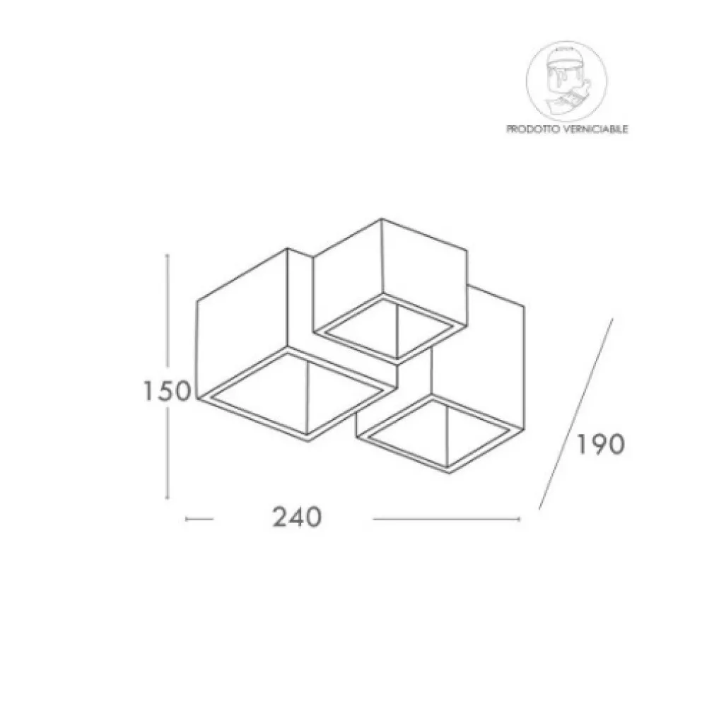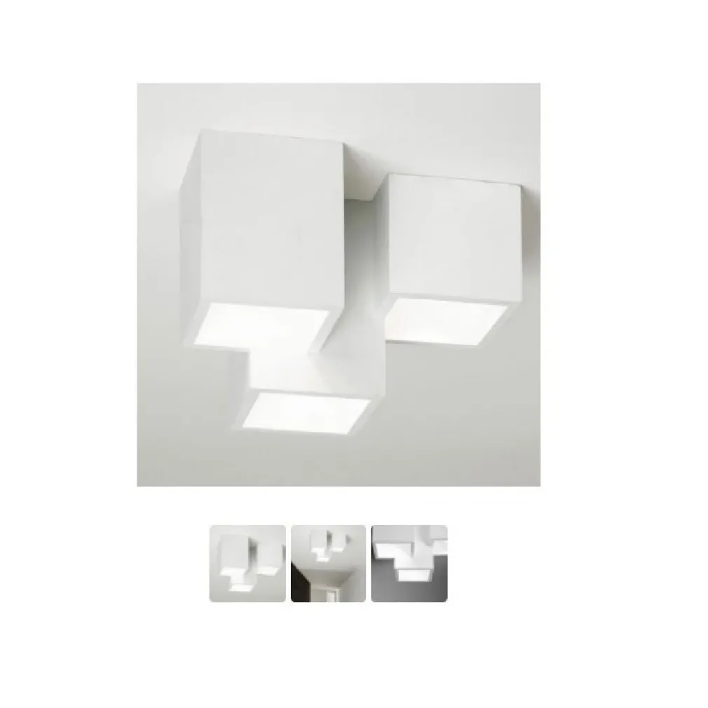 Elegante plafoniera in gesso dal design moderno di colore bianco adatta per installazioni a soffitto dotata di 3 diffusori quadrati con portalampada GU10 adatta per l’illuminazione interna di salotti, uffici, cucine moderne, soggiorni, per l’illuminazione di negozi, attività commerciali, ristoranti per dare un tocco di eleganza ai propri ambienti interni. La struttura della lampada è realizzata in gesso bianco e può essere dipinta con colori specifici all’acqua secondo l’arredamento. Ha una forma di 3 quadrati sfalsati ed emette una luce diffusa e concentrata a seconda del grado e del tipo di lampada inserita. La lampada da soffitto è provvista di tre portalampade attacco GU10, le lampade sono intercambiabili quindi in caso di rottura basta sostituirla a differenza di prodotti con LED integrati. Si alimenta direttamente alla rete elettrica a 230V e non necessita di trasformatore, ha un grado di protezione IP20 (quindi adatto solo ad ambiente interni con assenza di umidità). IL LED è particolarmente interessante per la caratteristica di efficienza luminosa. L’evoluzione dei materiali è stata la chiave per ottenere sorgenti luminose che hanno le caratteristiche per sostituire quasi tutte le lampade ad oggi usate, quindi: elevata affidabilità, lunga durata, elevata efficienza, basso consumo.