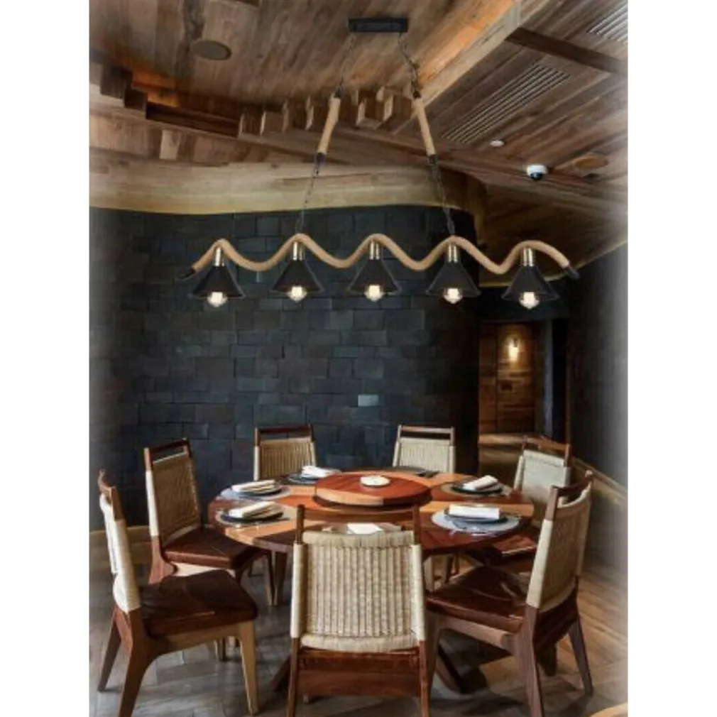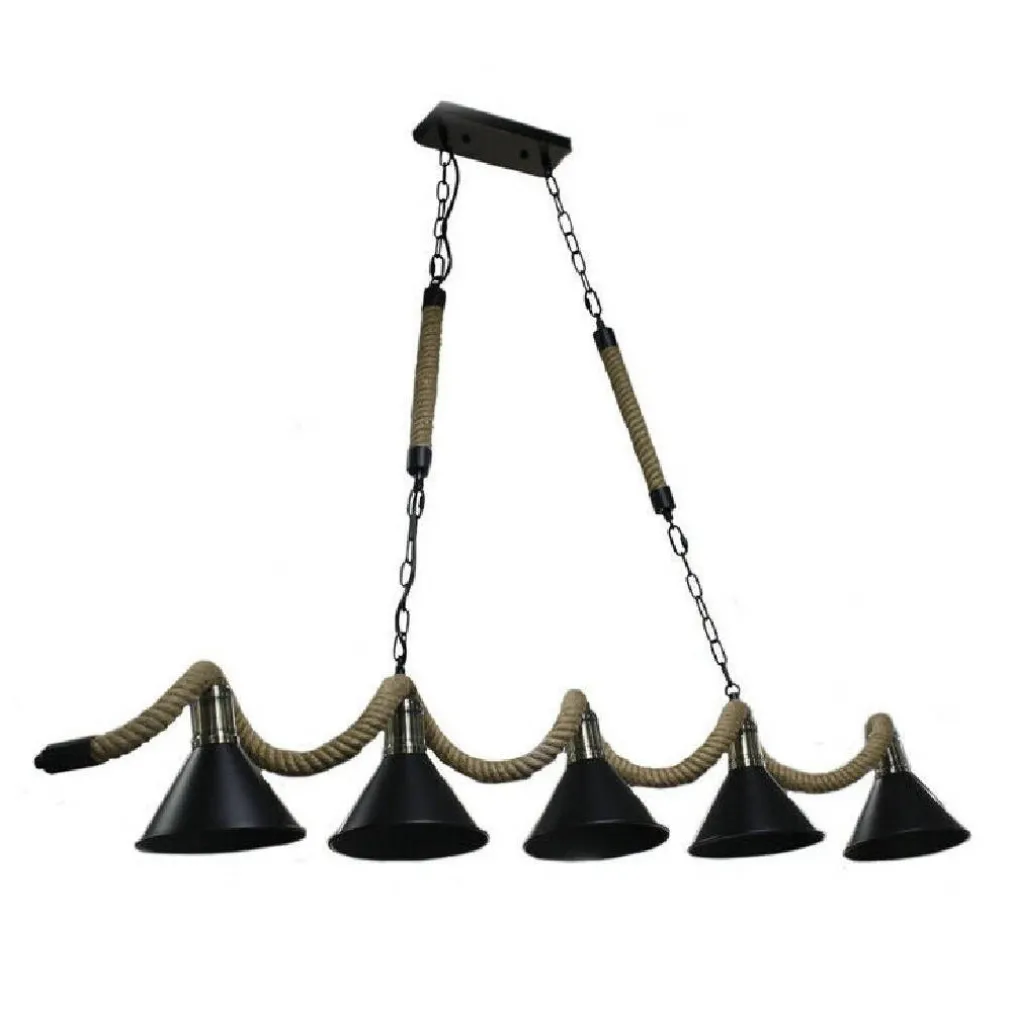 Lampadario a sospensione dal design rustico con corda in canapa perfetto per arredare casa con originalità. Dotato di 5 portalampada con paralumi a forma di campana con attacco E27, perfetto per casa, bar, pub e ristoranti.