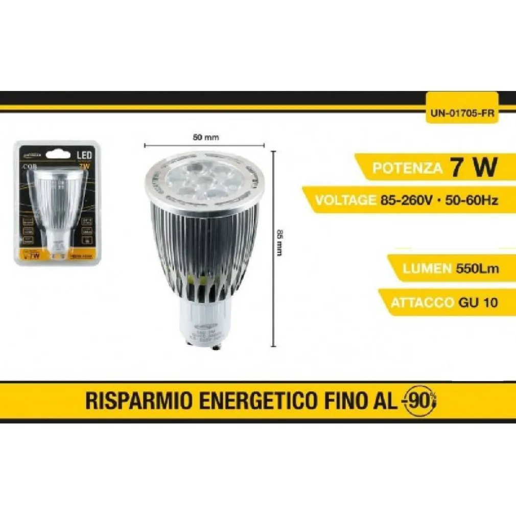 Lampada LED COB 7W GU10 sostituisce la tradizionale alogena con un risparmio fino al 90% di energia. Offre una luce di qualità mirata e alta. Facilità di installazione, bisogna solo rimuovere la vecchia lampadina e posizionare la nuova lampadina a LED. Per le sue dimensioni, e il basso consumo energetico sono ideali per i display di illuminazione, armadi, corridoi, ecc.