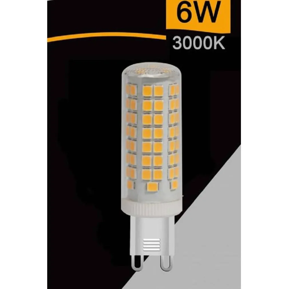Lampadina LED da 6W di potenza con attacco G9 e tecnologia LED SMD. La sua forma tubolare è realizzata in materiale plastico e la sua copertura è trasparente. Con fascio luminoso di 300° e flusso luminoso fino a 680 lm, questa lampadina ad alta luminosità ha un rapporto fino a 113 lm/W. I suoi 6W corrispondono a circa 68W di una tradizionale lampada ad incandescenza.